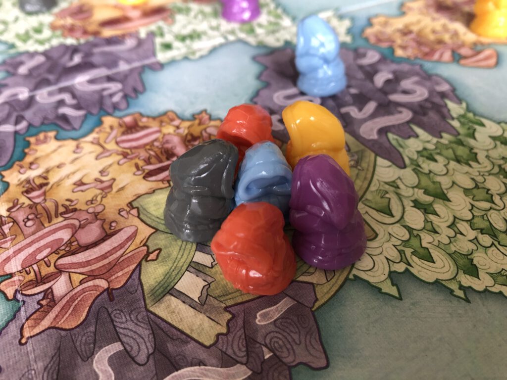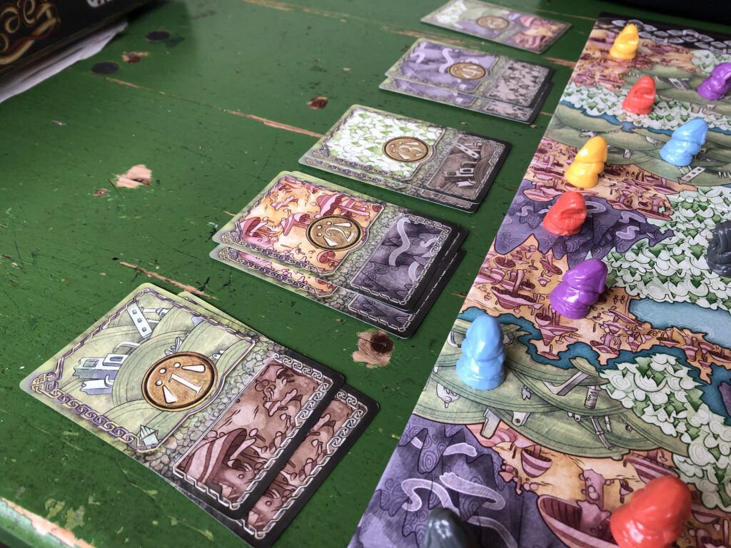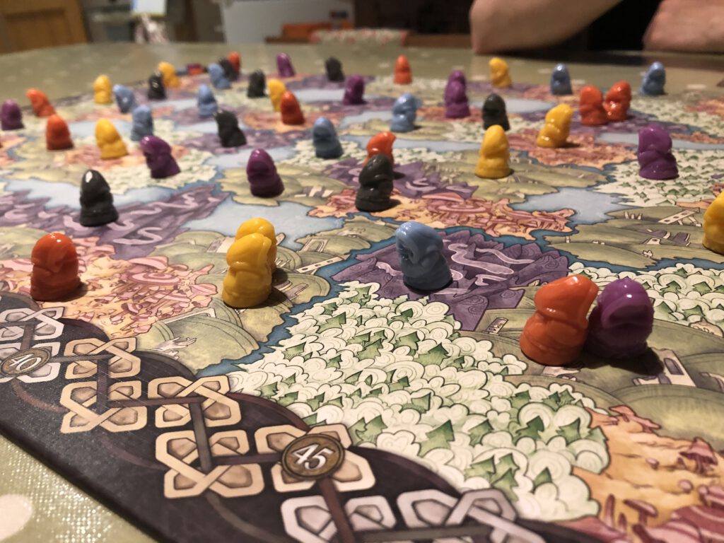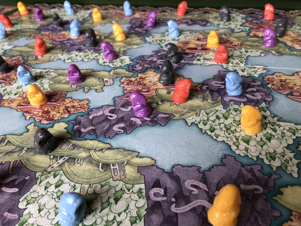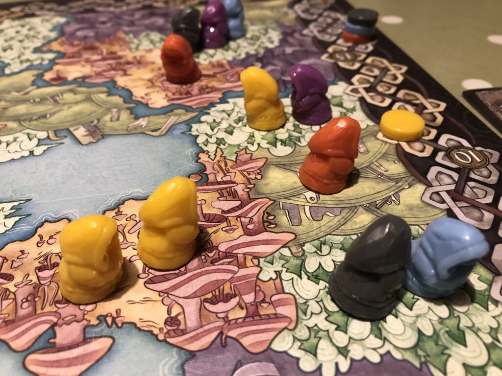 The board shows a mythical landscape broken into to regions, with each region containing five territories. At the start of the game, a Druid occupies each territory: there are five colours and each region is given one of each colour. Beyond that, where they’re placed is entirely random.