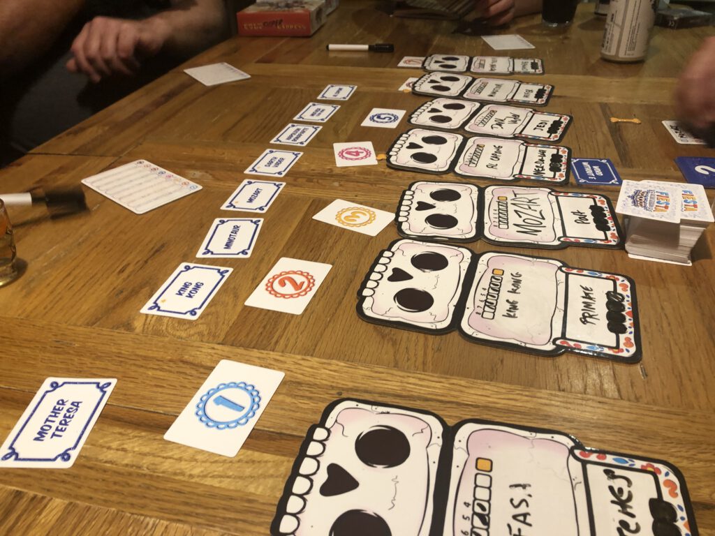 How the game works is not immediately intuitive so we’ll run through the process here. Each player is dealt a name card with a famous person – eg William Shakespeare – on that they look at secretly. They write the name on their skull card with the pens supplied, and then fold the top over so the name is hidden from everyone. Below the fold, they now write a single word that clues the name. For Shakespeare, someone might write ‘bard’. Then all the skulls are surreptitiously passed clockwise, with the name still hidden. The players receiving the new skulls rub out the clue, and write a new clue that relates to the word they can see. So, in our Shakespeare example, we receive a card saying ‘bard’, rub it out and write ‘singer’.