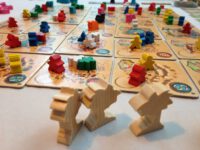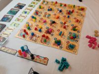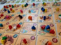 On your turn you take all the pieces off a tile of your choice and, moving around the board orthogonally, drop them off one by one. When you reach your destination (- the tile you drop your final tribe member on) you collect ALL the pieces of the colour you are ‘dropping off’ and use them to effect the special ability of the tribe in question – it might be collecting money, or resources, or pieces that score at the end of the game, or assassins, which can be used to either claim more tiles or go after an opponent’s pieces. But! You also get to use the special action on the tile itself, which again can be about improving your powers within the game and/or picking up points towards a win.