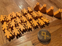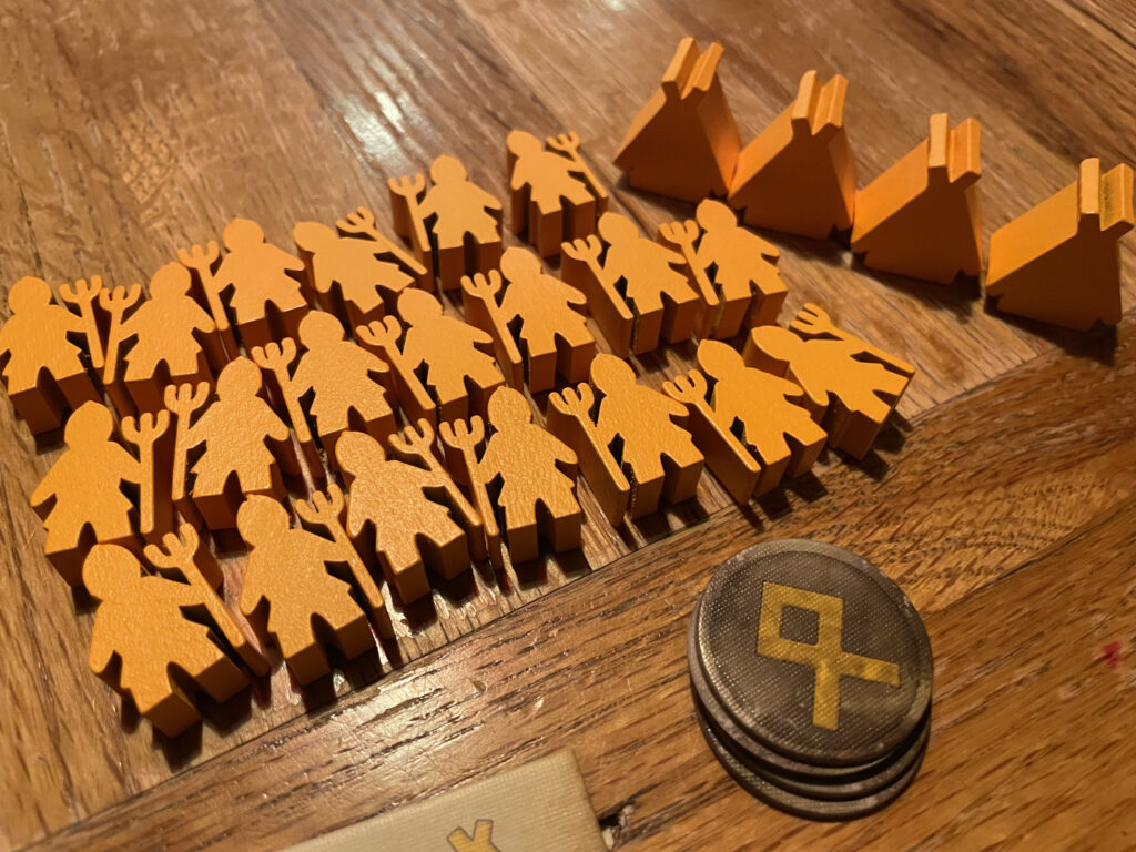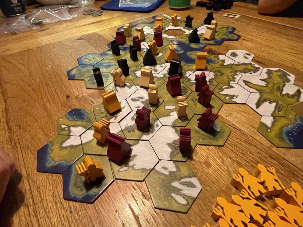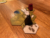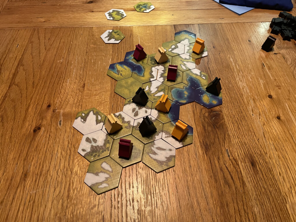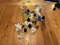 In the settlement phase, players take turns placing their viking pieces out on the board, following three rules: 1. they must be placed adjacent to either one of your tents, or one of your previously-placed vikings, and 2. they may only occupy tiles with grass on them. And the key rule 3: One viking per tile! This continues until nobody can legally place vikings any more, either because they’ve run out of tiles to put them on or – rather less likely! – they’ve managed to place all their vikings. The player who has the most vikings on the landscape is the winner.