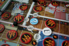 After each player moves their fire officer around the blaze, they must roll the dice at the end of their turn to see where exactly the fire is spreading. The board is gridded, and the dice tell you where in the grid to place a smoke marker. If there is a smoke marker already there, it gets flipped to a flame marker. If there is a flame marker already there, there is an explosion! We won’t go into the details here, but that’s bad.
