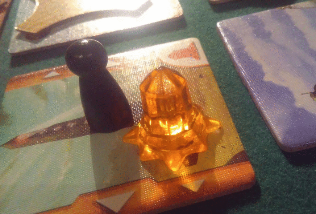 The board is made up of randomly distributed landscape tiles that are set out face-down (sandy side-up). Sand tiles are laid on top of some of the landscape tiles also. Players start at the crash site and move around the ‘board’ using a maximum of 4 actions: move (1 space) remove sand, excavate or pick up. Move and remove sand are pretty obvious – excavate means (as long as there is no sand on it) you can flip the landscape tile and discover what’s buried there. Some will be clues as to where to find the flying machine parts and some will be little bits of equipment to help you on your mission. There are also a couple of wells where you can refill your canteen – absolutely crucial in a game where if you canteen level reaches zero, you die. At the end of each players turn cards are revealed that move a sandstorm (represented by the absence of a landscape tile) around the board.
