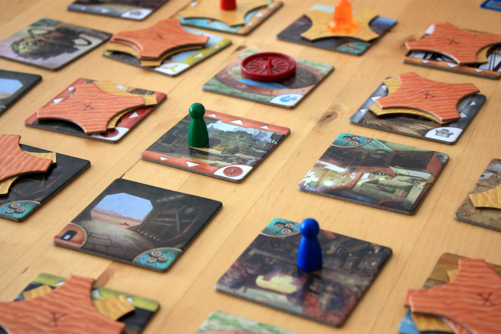 The tiles are laid out randomly and the equipment cards also shuffled. You can also play the game at different levels of difficulty.