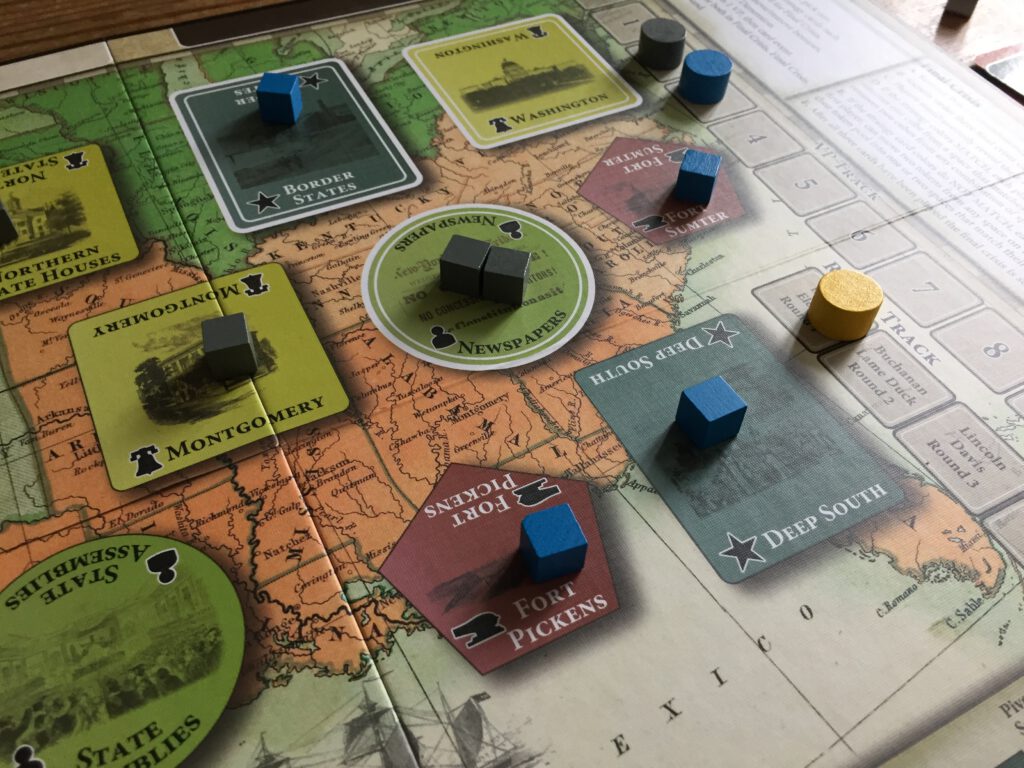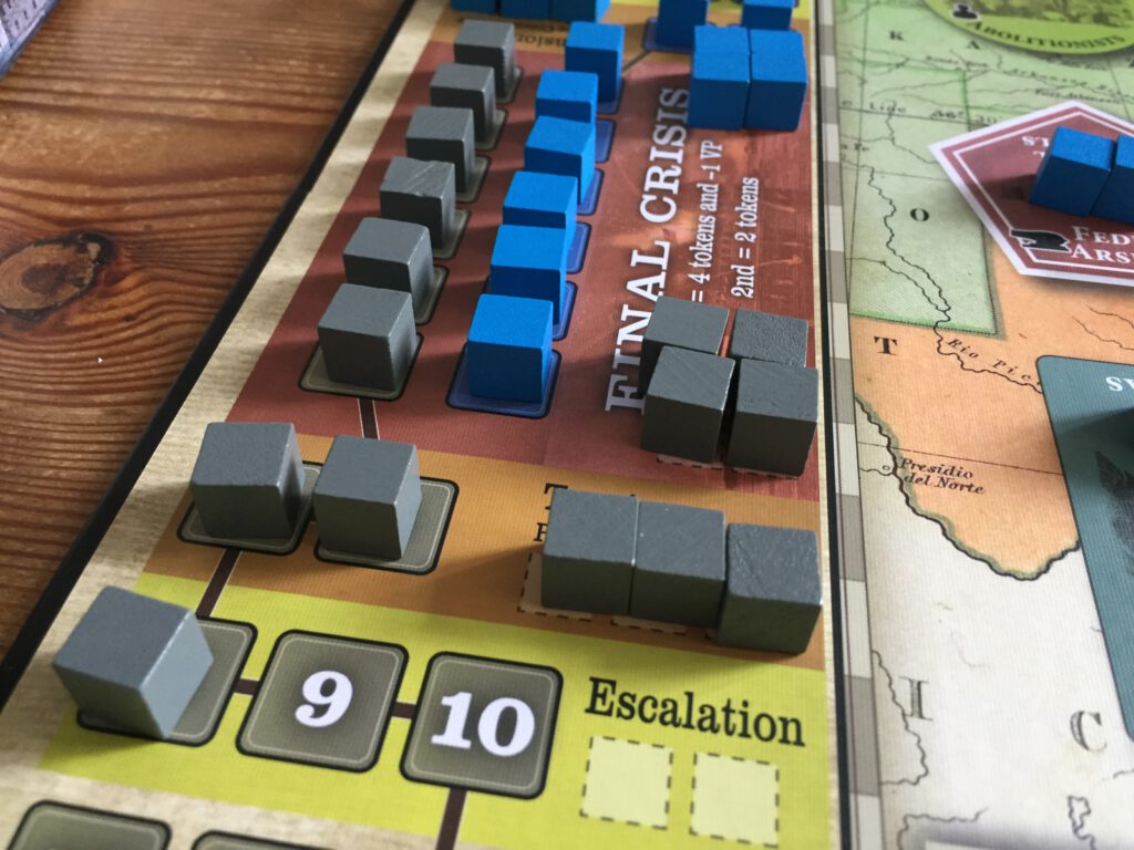 The game has a smallish board and two decks of cards – Strategy and Objective. On the board are four crisis dimensions representing the frontiers of the fight over secession: political opinion, public opinion, armorment and secession states. Each dimension is represented by three areas of control, and in each dimension one area – with a white outline – is pivotal.