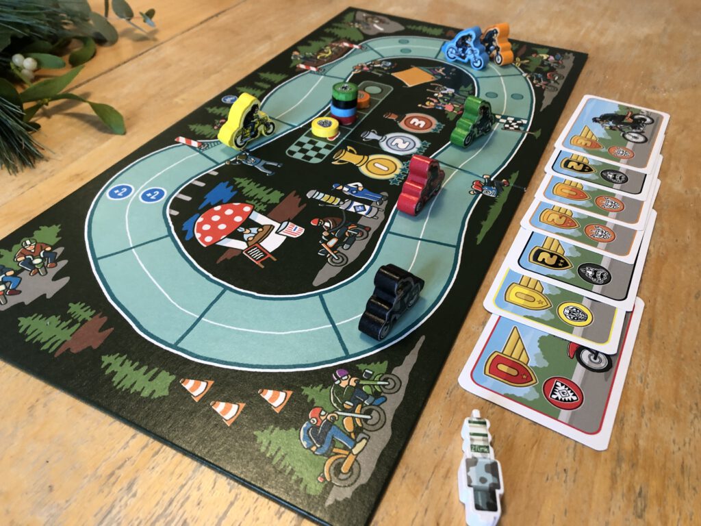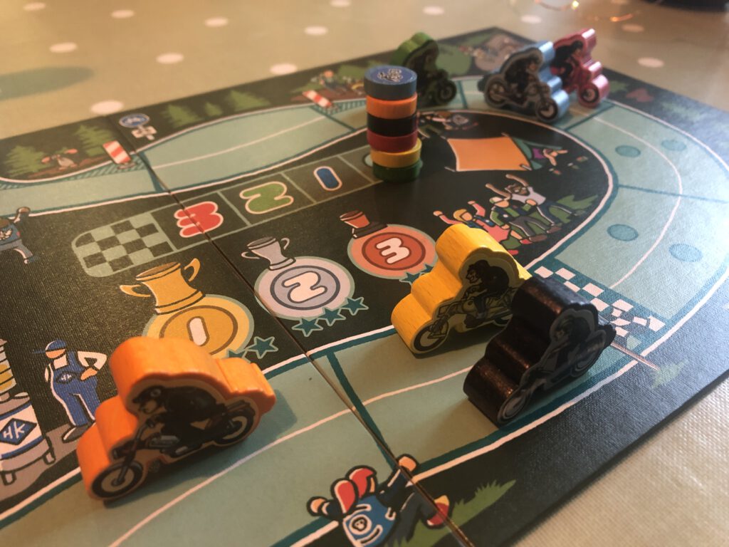When X number of cards have been flipped and the matching scooters – where possible – moved, then the starting player gathers up the cards and chooses one for themselves: the number on the card you choose is now irrelevant; you’re just betting that this rider will finish in the top three. The movement cards are passed around the table, with all players taking one as their ‘bet’, and the reminder go at the bottom of the deck. Then the spark plug is passed to the left and a new round begins!