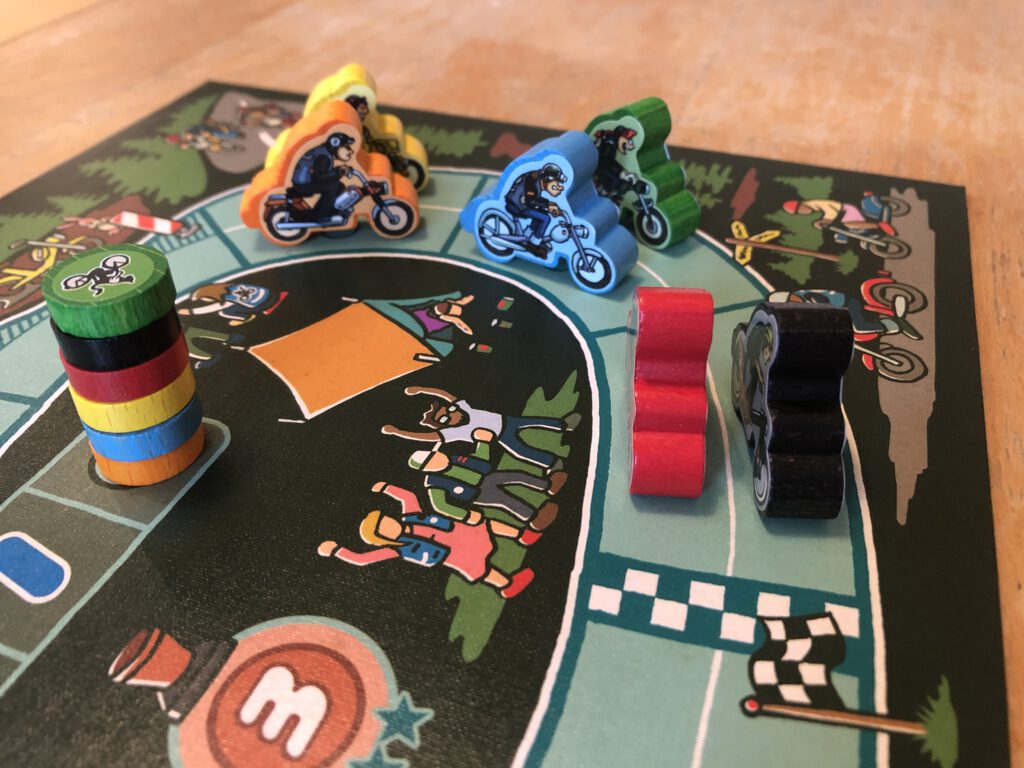 When X number of cards have been flipped and the matching scooters – where possible – moved, then the starting player gathers up the cards and chooses one for themselves: the number on the card you choose is now irrelevant; you’re just betting that this rider will finish in the top three. The movement cards are passed around the table, with all players taking one as their ‘bet’, and the reminder go at the bottom of the deck. Then the spark plug is passed to the left and a new round begins!
