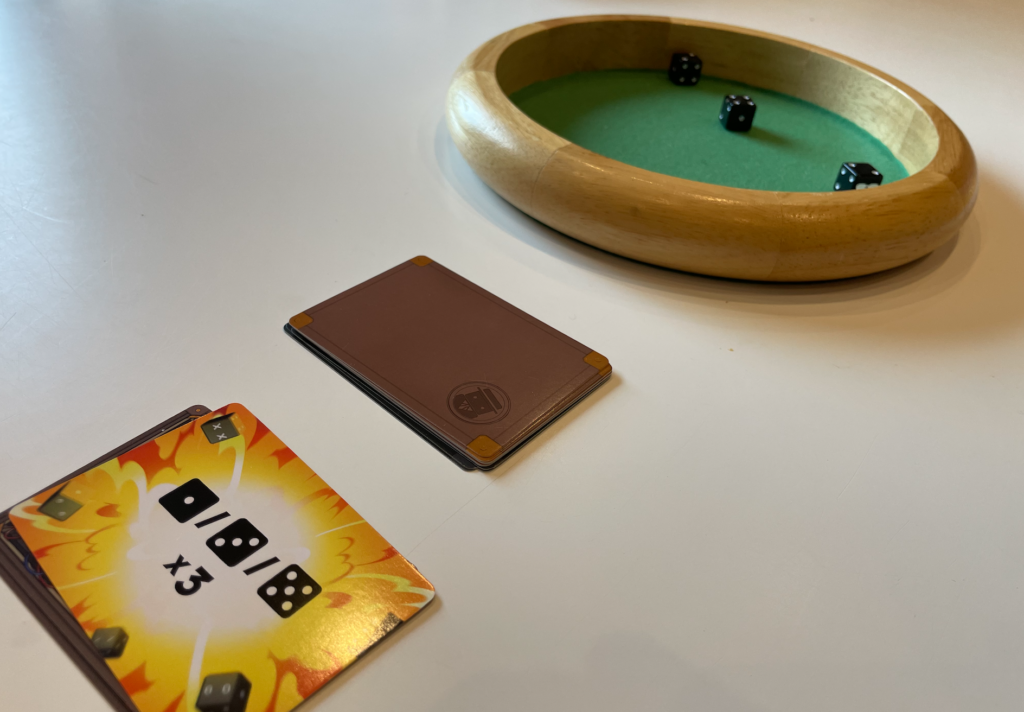 These combinations are revealed on cards, showing for instance that if after your final roll you have a run of numbers, you’re bust. Or if you roll two fives at any time, you’re instantly bust. So there’s a lot of luck involved and things can blow up in your face. But there’s also some control in how you go about things and how much you risk: including how many dice you roll in the first place. The cards also form the game’s timer: when the deck runs out, the game is over!