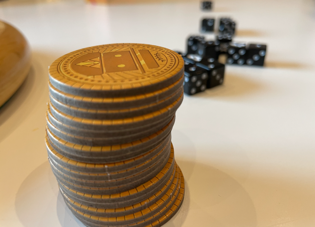 As well as the dice you begin with, everyone also has a stack of chips, each worth three dice (or three points, of course). At any time in the game players can buy dice off each other with these chips, and no doubt this will occur as players run out of dice and need to resupply. After the final round, each die is worth a point and each chip worth three points. Most points wins!