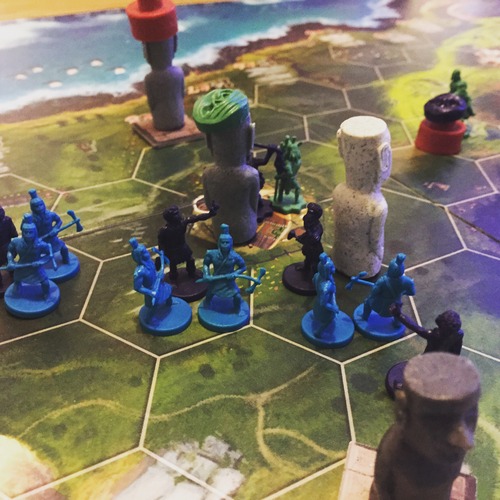 You can place your sorcerer in a variety of special hexes on the board (he also functions as a worker) that can get you more workers, more tribe markers, or wood, which helps in the moving of Moais. He places (and effectively reserves) platforms for you to place your statues on. He can also get you hats you can place on your Moais – like the statues, they need to be moved into position by workers. Finally as well as your tribe markers functioning as coins in the bidding, they can also be used to ‘mark’ a Moai or hat that is still in transit at the end of the turn (so it doesn’t get pinched by another player!) or played to get rongo tablets. Rongos only come in halves, so you need to get two of them to actually use a rongo, which allows your chief to function as a sorcerer. Unplayed rongo tablets also get you points at the end of the game – which is over when any one player has covered all their platforms with Moais.