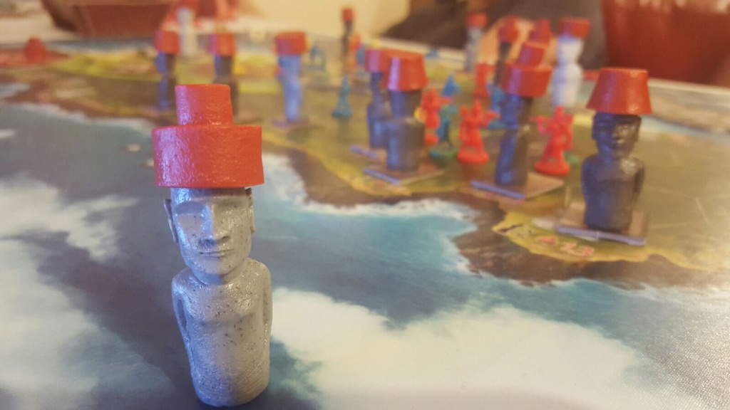Scoring is simple – the black number next to the Moai each player has built gets multiplied by the level of Moai built on it. Then additional scoring for hats  (red numbers) and finally complete rongo tablets are worth points too: 3 points in the original rules, but we suggest following the designer’s advice and changing that to a single point instead.
