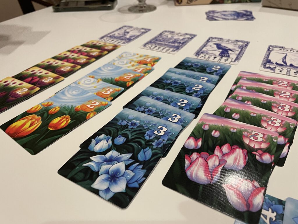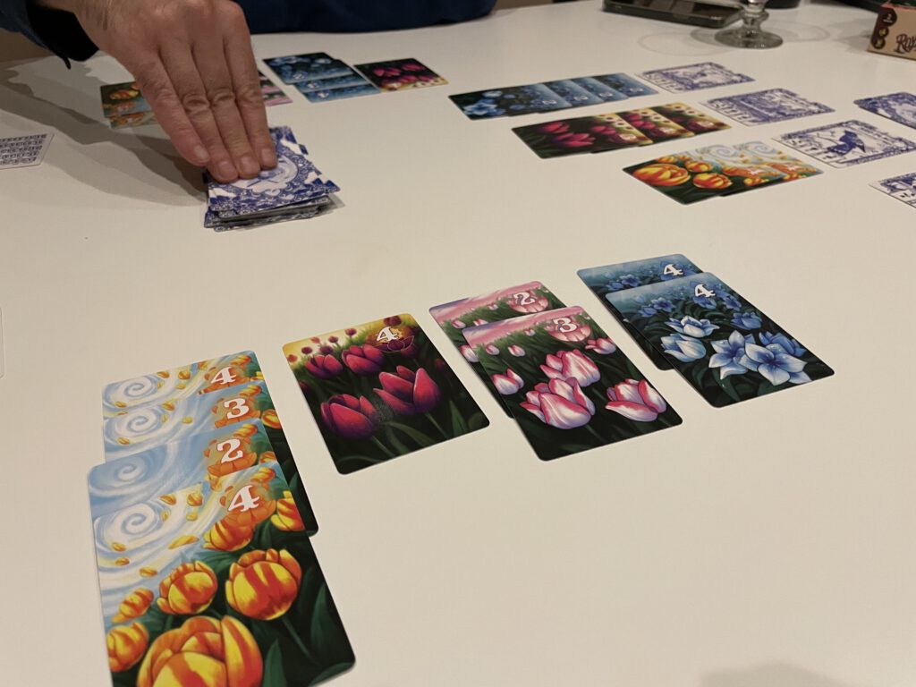 It feels like the most sensible thing to do to is keep adding cards to your own sets, or manipulating the shared sets. But gifting cards can score quite a lot of points, especially if you give away the currently-most-valuable tulips. Ideally, you want to give them away while they’re worth points, then devalue them before the game ends. When it does end, the secret set if shuffled then the top five cards only are added to the central, value-defining sets. Players score points for having the most in each of the top three colours of tulip (the fourth-best scores nothing!) and the player with the most points wins the game.