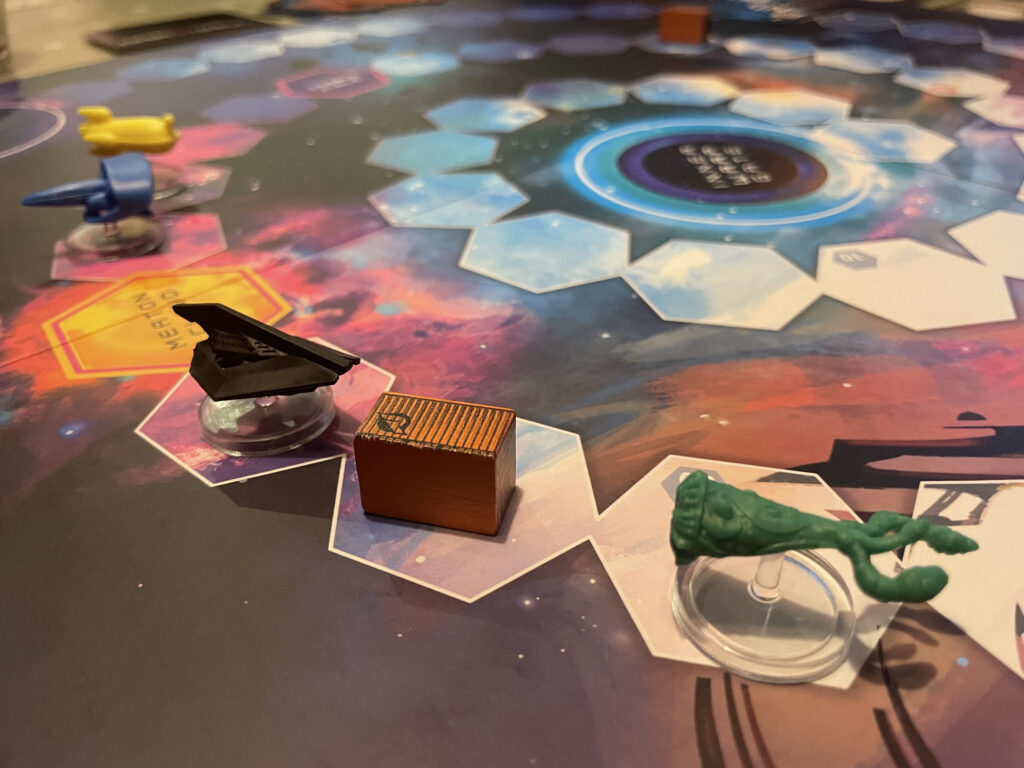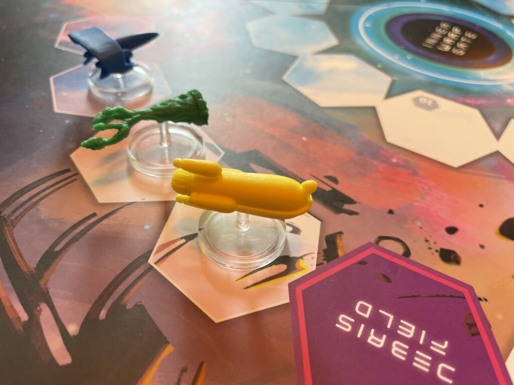 The board shows the path along which all ships will travel, with an inner gate at one and an outer gate at the other. Players start in the middle (2-4 players) or at either gate (5-6) and your goal is to reach the other end of the path. There are two pieces of debris in the path as well: all ships, and both debris count as objects.