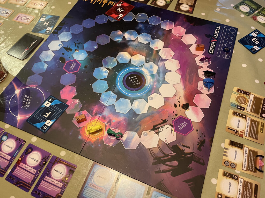 I do like games with chaos and chance, and I like games with surprises. I also love a space theme. But I think you need more than constant chaos, and to have any agency at all here means doing some Hawking-esque computing (x ships in y/z/etc positions, n card possibilities) with poker-champion table-reading abilities to second-guess what anyone might do any how it would affect you – depending (again) on the order players activate in. It’s well-produced, with an ingenious central idea. But after a fun 20 minutes, there’s a sense that you’re more often hoping for the best rather than having any actual control over where you’re going. If chaos in space is your bag, you can ignore my reservations. If not, Gravwell may frustrate as much as it entertains.