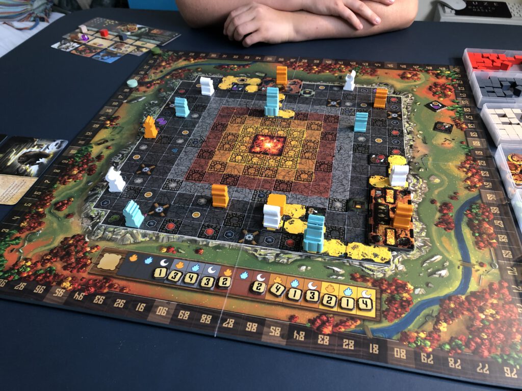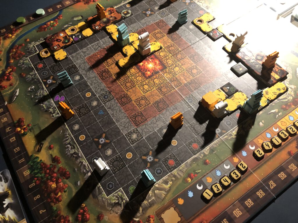 The final resource is magic, which can be spent on spells. There are always three available during the game and the do a variety of things; none of them are absolutely necessary to play the game, but clever use of them can be necessary to win it – ignore them at your own risk! The end of the game is triggered when anyone completes their trollsmoot (ie they place their final troll on top of their two top trolls) and the final scores are tallied.