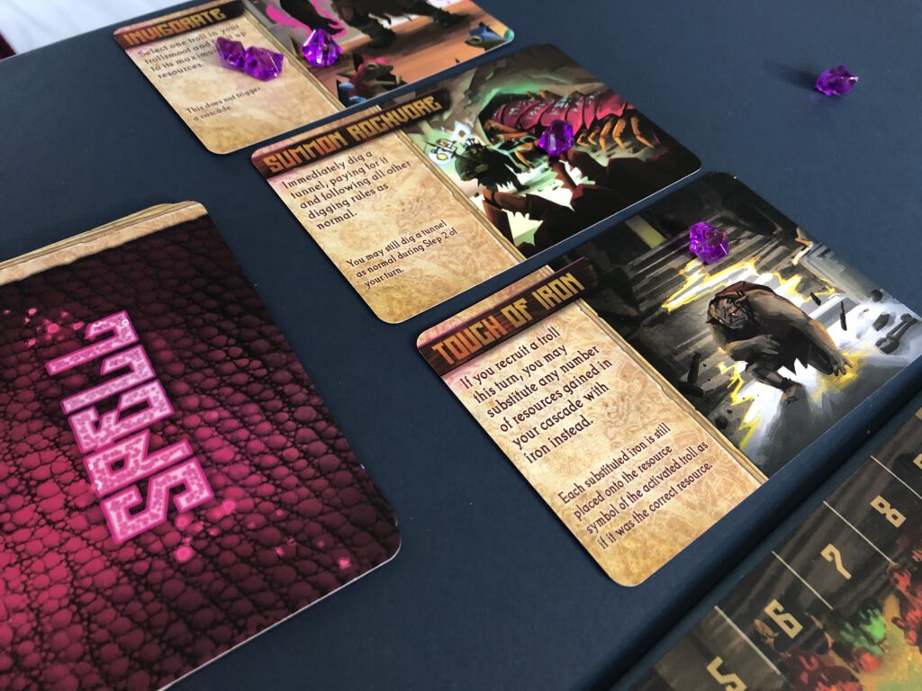On every turn, your choice is simple. You can either dig a tunnel, or recruit a troll. Simply put, recruiting gets you resources, and digging spends them. When you recruit, you take one of the face-up trolls from a communal tableau of troll cards, and add it to your trollsmoot: note that your trolls must form a pyramid, so every troll is supported by two beneath it. The just-recruited troll will bring some resources with it, but – if there are no resources on the cards already – it will also cause a ‘cascade’ – any trolls beneath it also ‘fill up’ with the resources on the cards. Some trolls are free to recruit; the better trolls cost you money – the tableau is also a pyramid, with the more alluring recruits at the top, and to reach them each troll beneath must be paid a coin.