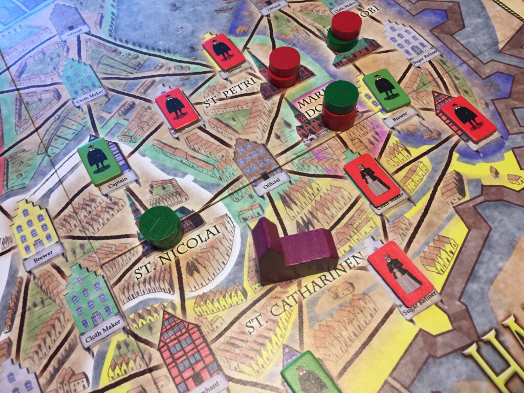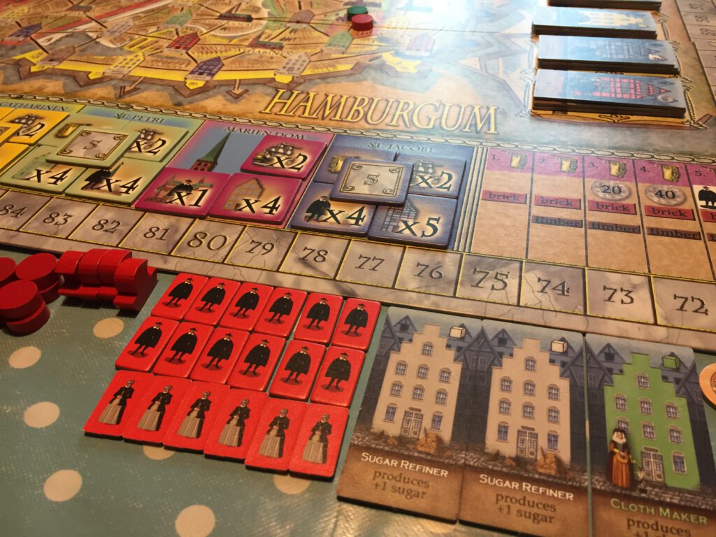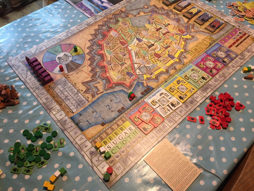 In Hamburgum, players represents traders in the medieval city seeking their riches. Despite the intricate board and plethora of bits, the game is surprisingly easy to play once you get to know it.