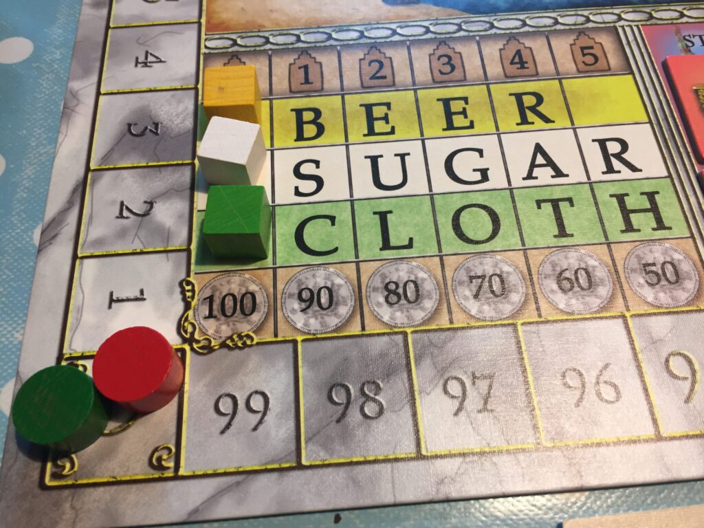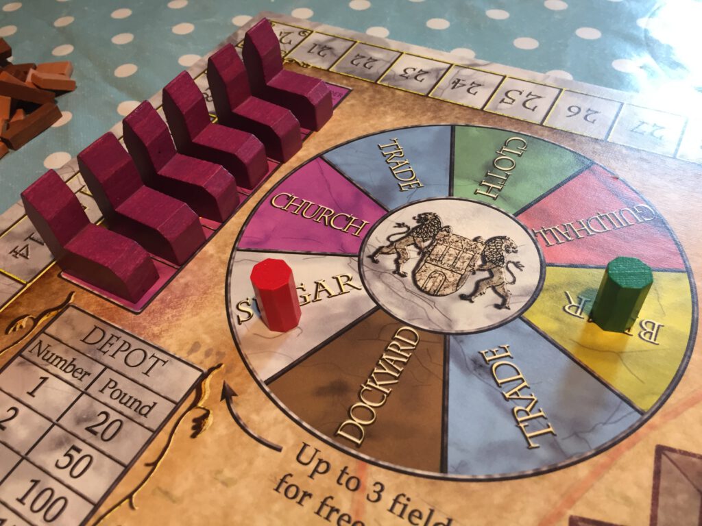 The heart of the game – and the top-left of the board – is the rondel, a circle of actions that set the parameters for what you can do each turn. Each player has a marker on the rondel, and on your turn you may move up to three spaces clockwise around it (- further if you are willing to pay for the privilege) and take the action on the space you stop at. Beer, Sugar and Cloth are straightforward: you simply produce a cube of the resource in question – each player starts with a production value of one, but building extra buildings boost your production. This construction takes place by stopping at the Guildhall: pay a wood and a brick to build the building of your choice; the catch being that the more production buildings that are built, the less money the resource in question is worth. Whenever you build a building, you can add a citizen to the board, which are a way to score points when you go to Church – more on the church shortly.