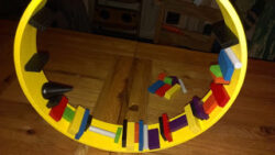 Each player takes a set of coloured wooden pieces (7 in all) and in a two player game players can take two sets. The large wooden wheel is placed centrally between all the players, with the cone-shaped starting pawn at the bottom. The first player adds a piece to the wheel, starting the ‘building’ in a certain direction. Play moves clockwise and players have to follow a simple set of rules: