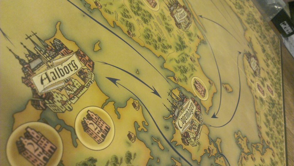 The board is placed centrally and players take pieces of their own colour – specifically, a ship, and three Thalers (money). On your turn, you move your ship along the various routes of the board, always following the movement restrictions (routes are one-way!) Having arrived at the next port, you choose from one of three options: Buying goods, selling goods, or building a Market at the port. Buying goods is vital, because you can’t build markets without any goods, and without any markets you have little chance of winning. Selling goods is also vital because if you don’t sell anything, you won’t have any points at the end of the game!