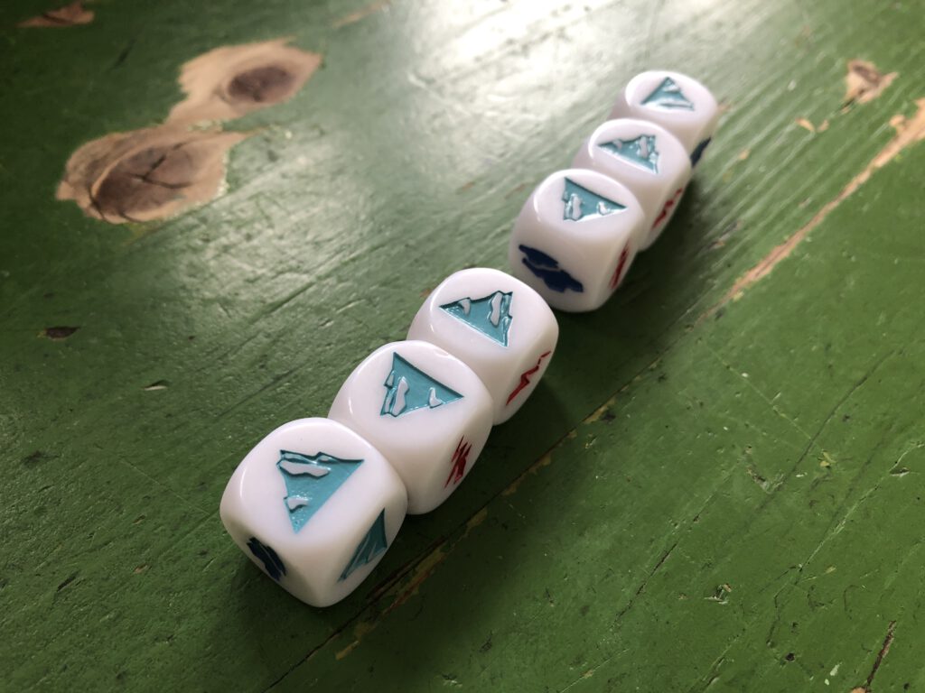 The board shows the mountain itself, and the root from base camp through the bivouac spaces (shared by climbers) and the climbing spaces (one climber at a time!) On your turn you roll the six dice hoping to roll the helpful mountain sides (climb!) rather than the unhelpful cloud sides (do nothing) and the red danger sides (bad). You’ve then two choices: you can either move one climber forward the number of mountain spaces rolled, or you can push on and roll all the dice that came up red again. If you roll mountain (or cloud) sides, you’re okay to continue as above. If you roll all red sides, however, you’re essentially bust: your highest climber falls down the route to the next available spot.
