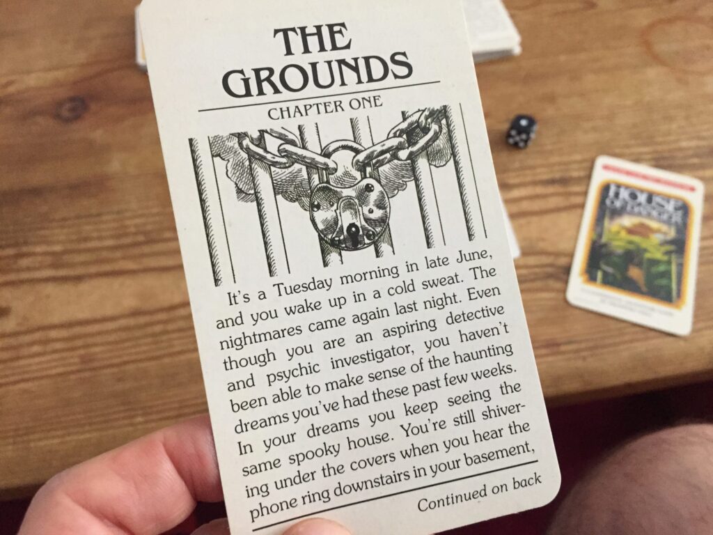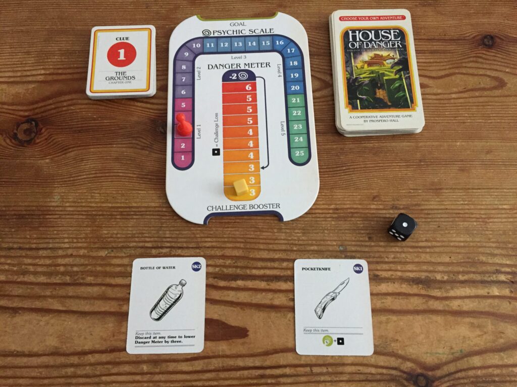 It’s both. House of Danger is a new imagining of the 1980’s Choose Your Own Adventure stories, in a slightly gamified package. Rather than a book, this adventure takes the form of cards – five decks of Story cards (one for each chapter of the story) each with an attendant deck of Clue cards that represent either equipment to take with you, or smaller branches of the story. We can’t review the game itself of course without littering the text with spoilers, but the experience is very kid-friendly – as long as the kid in question is of an age where the subject matter won’t faze them.