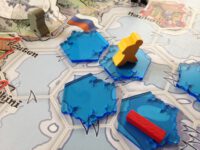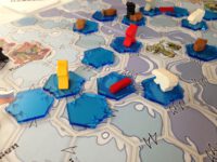 But the real challenge is the ice itself. It’s constantly moving, drifting north or south or just rotating on the spot. If neighbouring ice flows slide by each other neatly, your explorers can just step from one hex to the next. But if the ice hexagons show a jagged edge you’ll need rope to cross (two ropes if both hexagons have jagged edges). So you are constantly trying to get more rope, or more fish, depending on your situation – and of course both can be scarce.