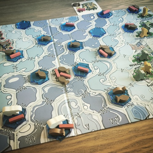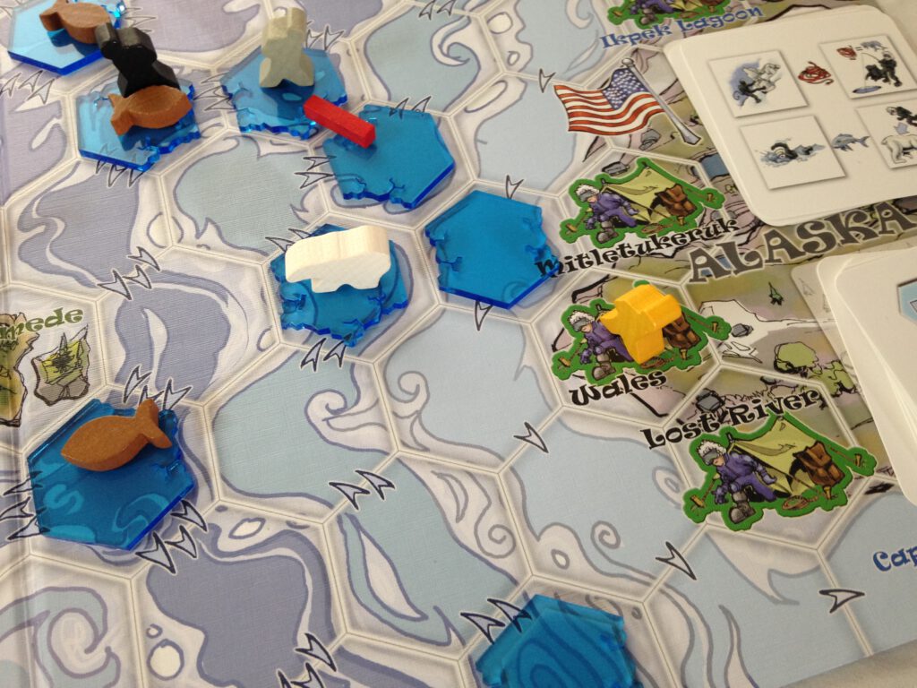 Each player starts with three explorers, some fish and a rope, based in Alaskan coastal settlements and staring out across a hexagonal grid of sea and ice. The game is quite simple in terms of what you are trying to do – get your explorers across. You can cross ravines using rope, distract polar bears with fish and also – stretching the realism somewhat further – use the energy you get from eating a fish to swim through Arctic sea water.