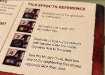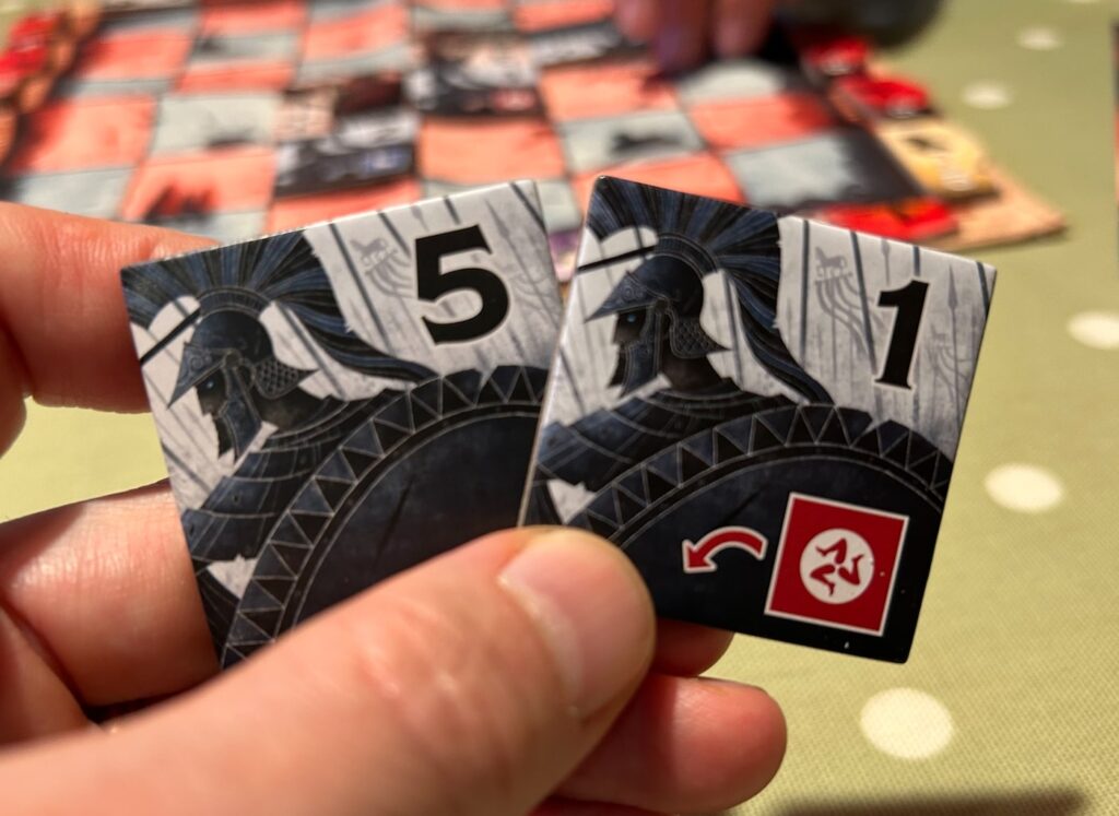 At its core, it’s quite simple. But apart from the high-value 5 tiles, each number also has an optional special power. With a 1 tile, you can reposition an opponent’s tile somewhere else on the board. With a 2 you can move one of your own. With a 3 you can swap a scoring tile you’ve claimed – even one of the miserable minus-point tiles – with one from the pool. With a 4 you can flip both the 4 and an adjacent opponent’s tile face-down. And there’s one special tile called the Dolos: this scores the combined value of the tiles either side of it.