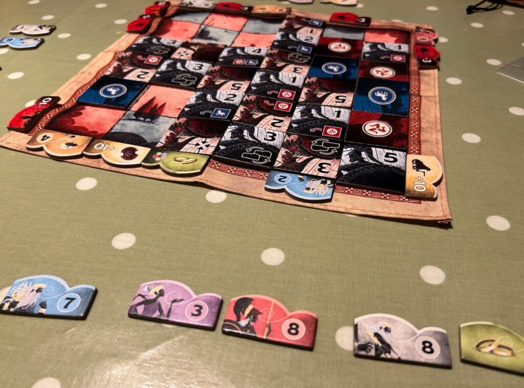 The game is played by players taking turns to add a tile to the board (you always have a choice of two) where they must be placed adjacent to an already-placed tile. Generally speaking, your goal is to have the largest collective tile value in a row or column when it’s completed: whomever achieves this gets first choice of the two scoring tiles, and the other player gets whichever one is left over. The game will end when the last tile is played and scoring tiles claimed: if only one player has a scoring tile of each of the five colours, they instantly win. If both players have managed this, then players score their highest-valued tile in each colours and – if you have them – factor in any +10 or minus tiles.