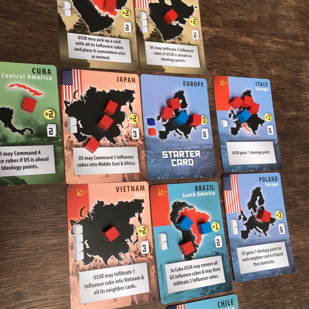 Having tried several two-player war games in Cousin’s War, 13 Minutes and Fort Sumter I expected this to be the same type of experience; an abstracted push-pull of cubes denoting control; and the type of game I don’t find particularly engaging. But whilst there are similarities, Iron Curtain surprised me. The fact players are laying out a tableau as they play is a neat twist because which card you place where is important, as you can only have influence in areas adjacent to where you have influence already. The minimalist deck means frequent visits will add another dimension to play as well – when you know what the events are on each card you can start factoring that in to your decision-making: not just your own cards but what your opponent might have. Very clever, and a lot of game bundled up in a small package.