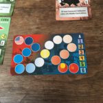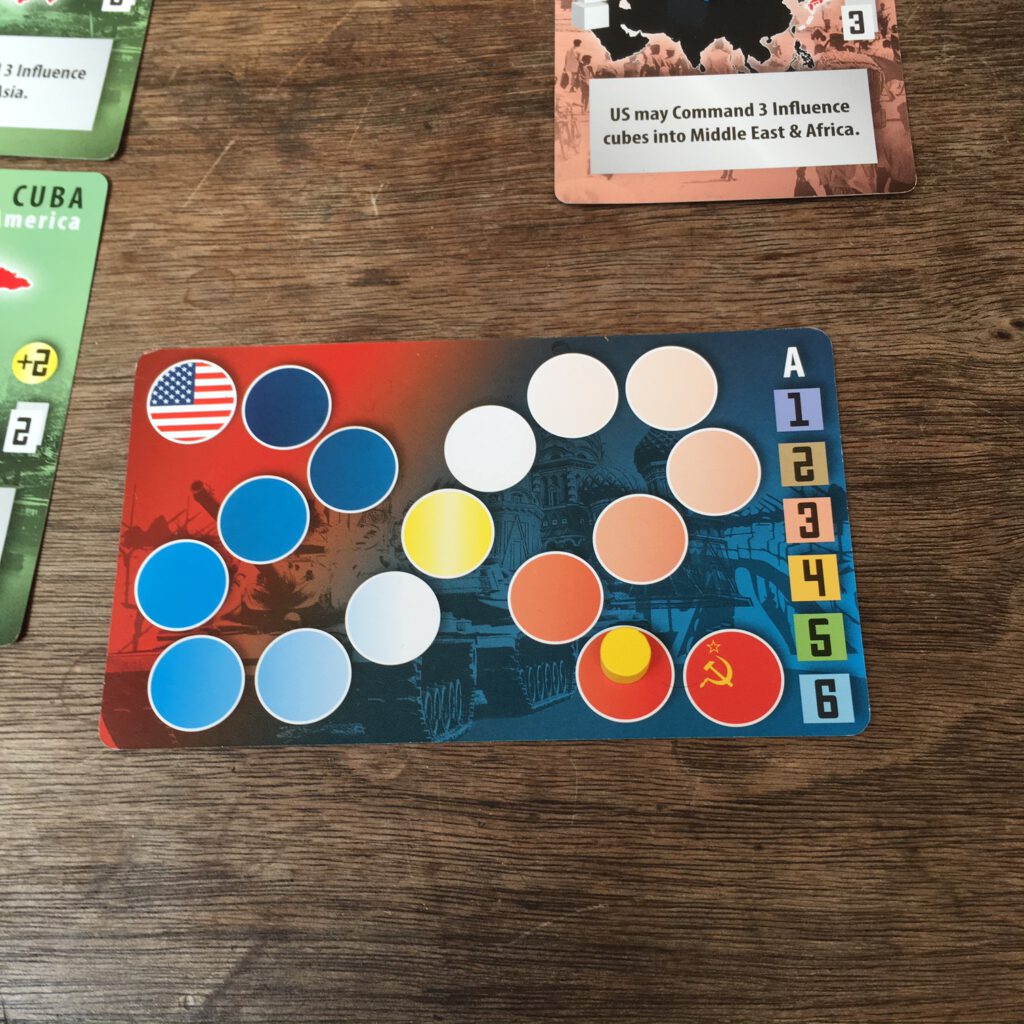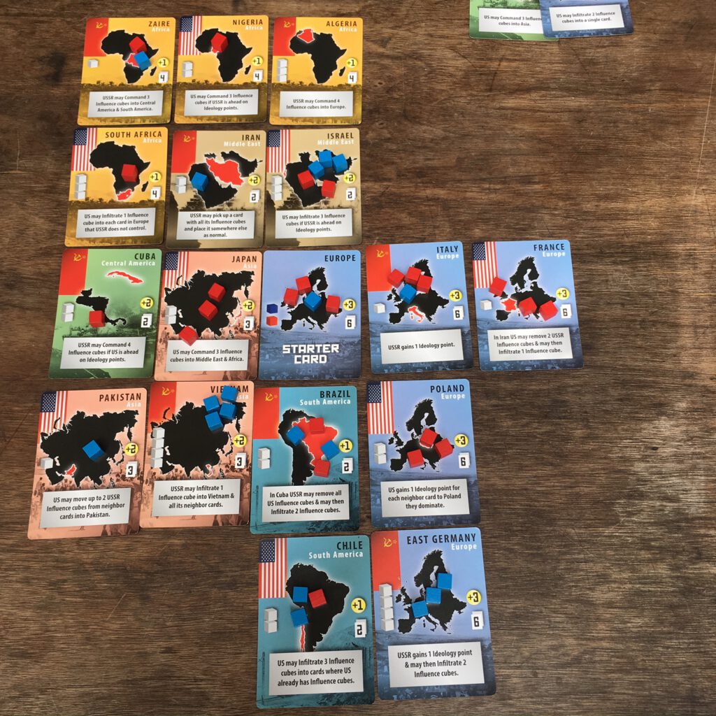 At the end of the first round, each player plays their last card face down as an ‘aftermath’ card, and at the end of the game, before final scoring, these are revealed. The operations points on them score for the player whose event is listed on the card, and again the game can end here. But if the score marker has not been pulled all the way to one end, all the continents are scored, in specific order, and the winner is declared.