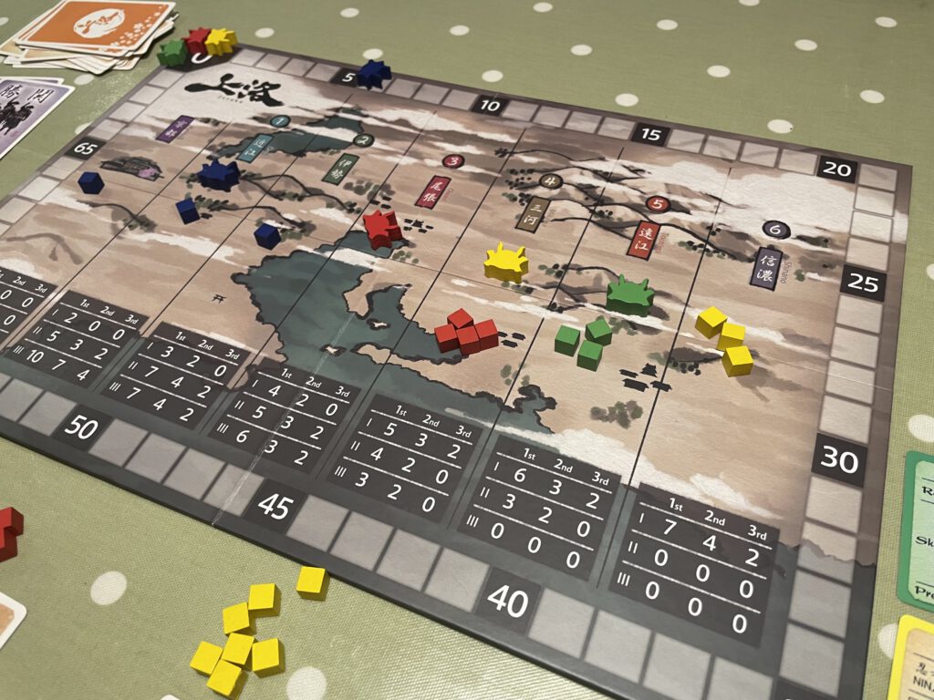 When all cards have been played, each region is scored for first, second and third place, and awarded points according to the numbers printed on the board itself. Critical to note is that eastern regions score better earlier in the game, while the western regions are more rewarding later. At the end of the third round, the player with the most points is the winner!