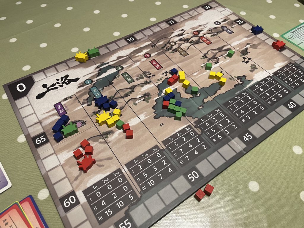 In Joraku, players are Daimyo of the Sengoku period of Japanese history, sworn to protect their emperor from every threat – including, it seems, each other, as everyone battles for control of the board – a partial map of Japan – via the unusual medium of [simple_tooltip content=’as with traditional games like Whist, one player leads a card and others follow suit if they can; the collected cards making the trick’]trick-taking[/simple_tooltip].