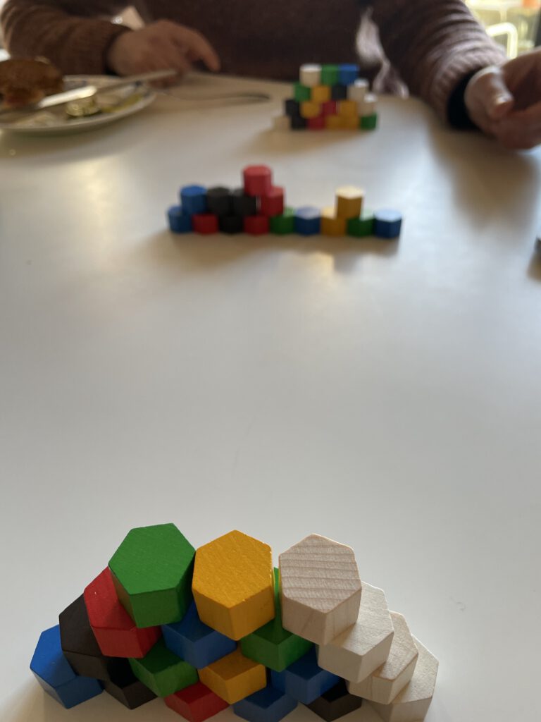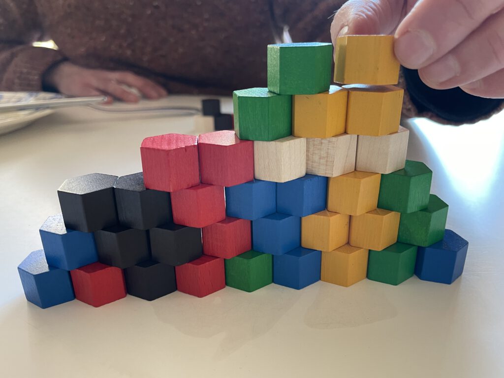 However, there are are couple of extra things going on. One is that your own blocks aren’t simply sat in a pile, available at any time. Before play starts, you must make your own mountain from your supply, kind of ‘programming’ it according to when you think the colours will be most helpful to you. And amidst your blocks are a couple of specials: the white blocks allow you to pass a turn, which is exceedingly helpful in the right circumstances. The natural blocks function as wilds, that can be played anywhere on the mountain – these can get you out of a pickle, but on the other hand, may also save your opponent’s from a pickle as well… finally if you make a triangle of matching colours on the mountain (ie a yellow on top of two yellows) there’s a penalty: an opponent gets to take a block from your supply for themselves.