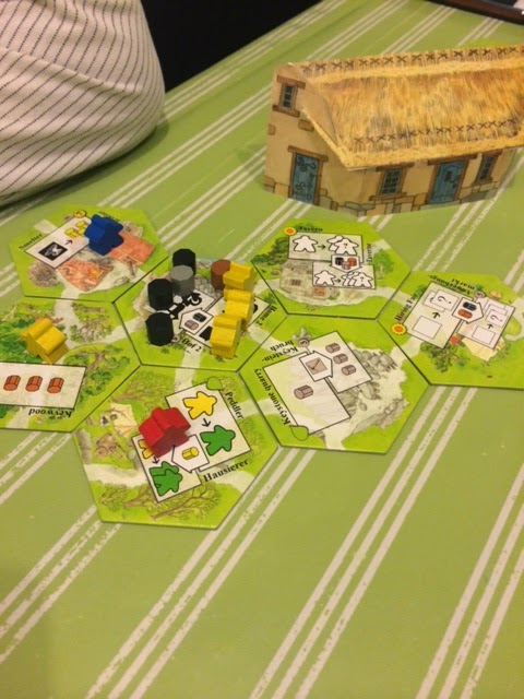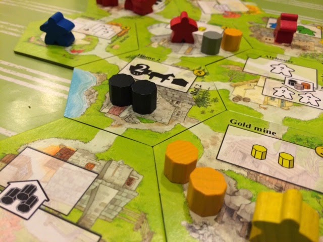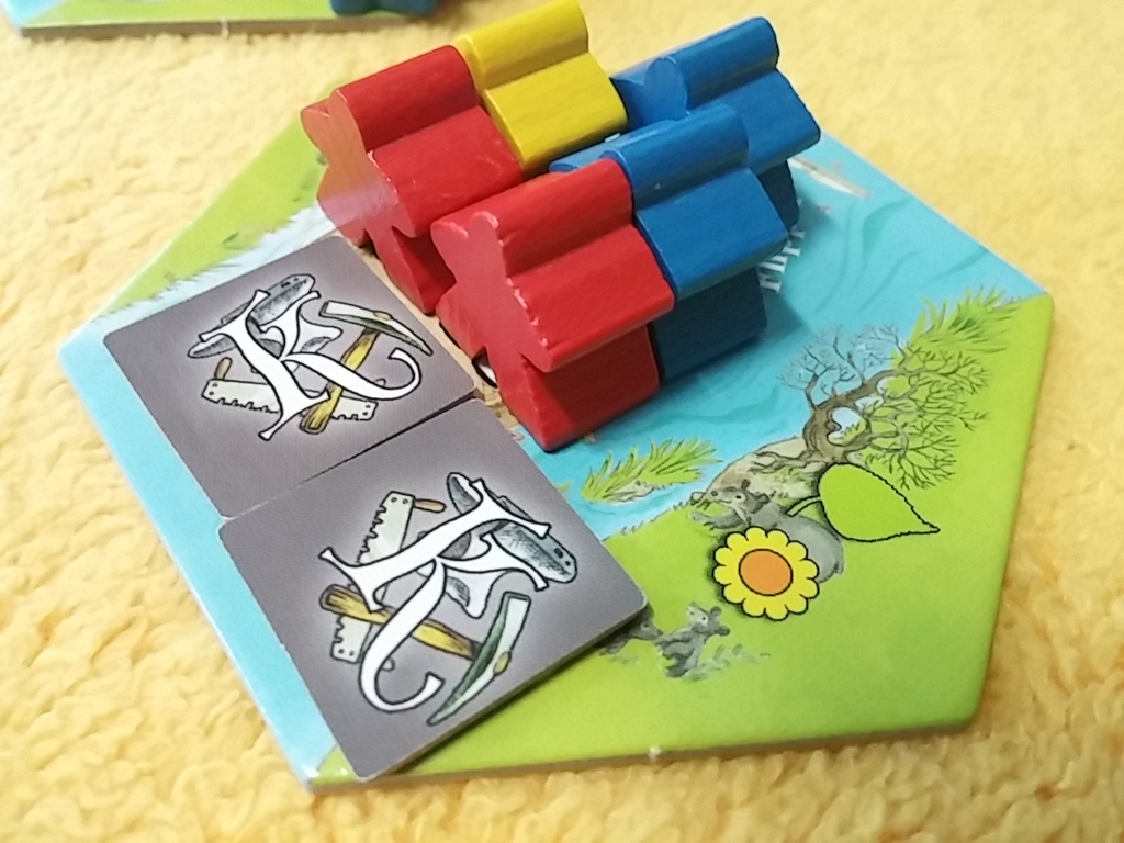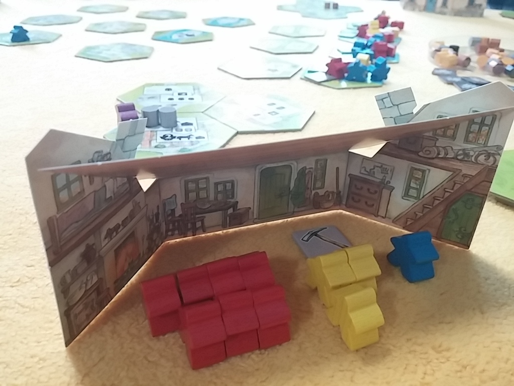 The villages are constructed from hexagonal tiles, and each player begins the game with a ‘home’ hex as well as several workers. The workers come in three colours – red, yellow and blue; and colours will be random as they are drawn from a bag. Your workers are kept behind a screen, so nobody’s aware what colour workers everyone else has.