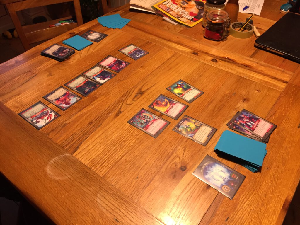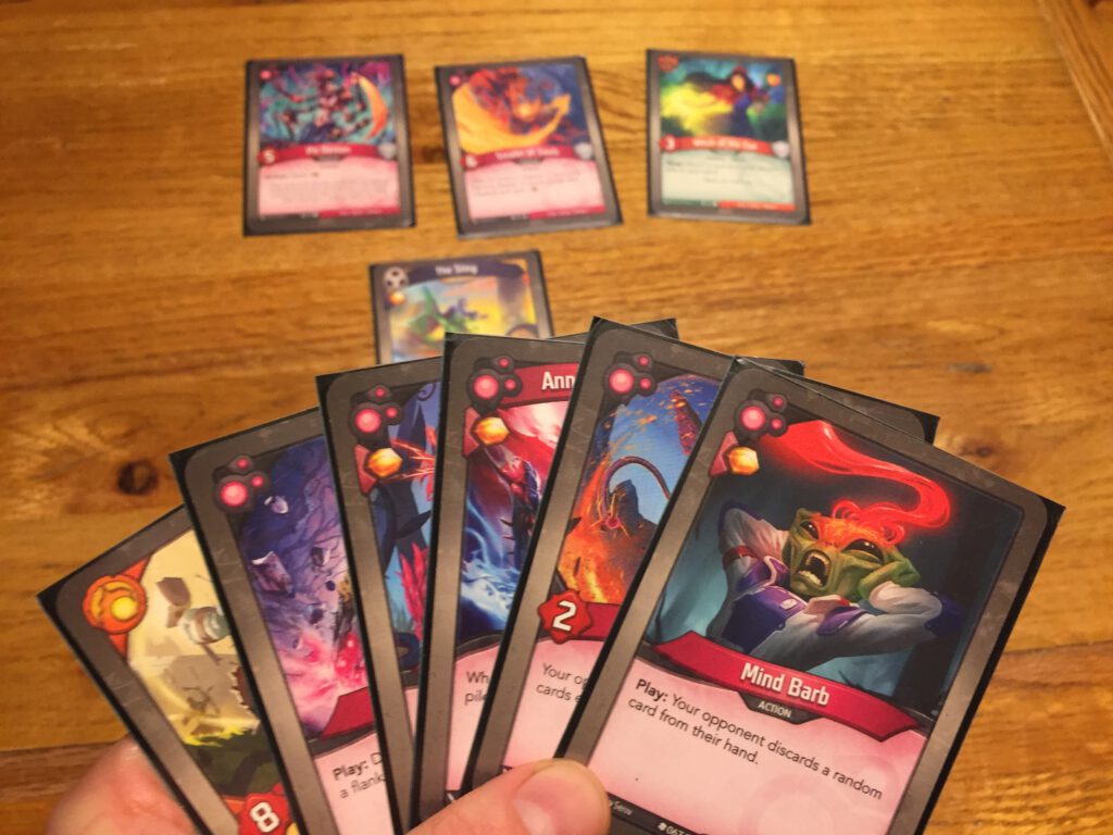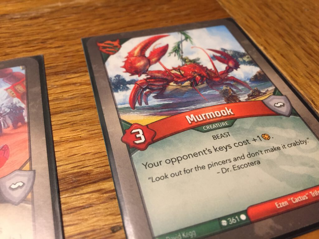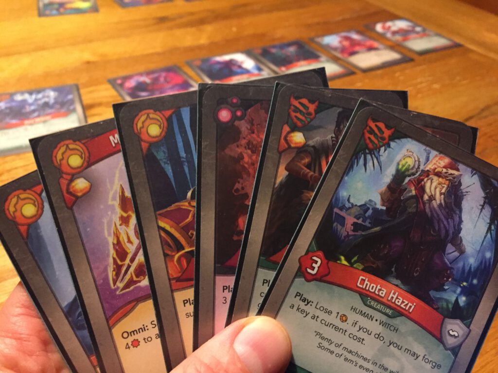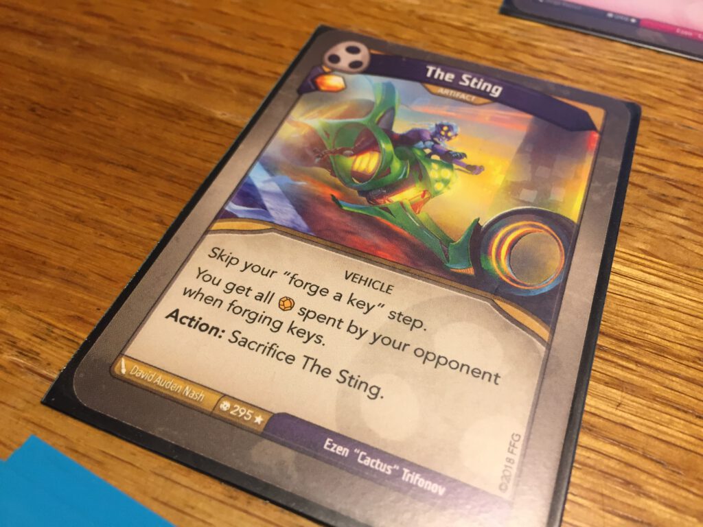 Your aim is to forge three keys: to do so you must collect amber: at the start of your turn if you have six amber, you can cash it in and forge a key. To collect amber, you can ‘reap’ your own creature cards by removing them from play, or activate certain cards that gather amber in other ways. Alternatively you can use your cards to stop your opponent doing likewise! What arises out of the fairly simple basic rules (there’s a lot of complexity around them, but each case is usually resolved by the text on the cards) is a tug of war as both sides push their own agenda whilst doing their best to hamper their opponent. The first person to forge the third key is the winner.