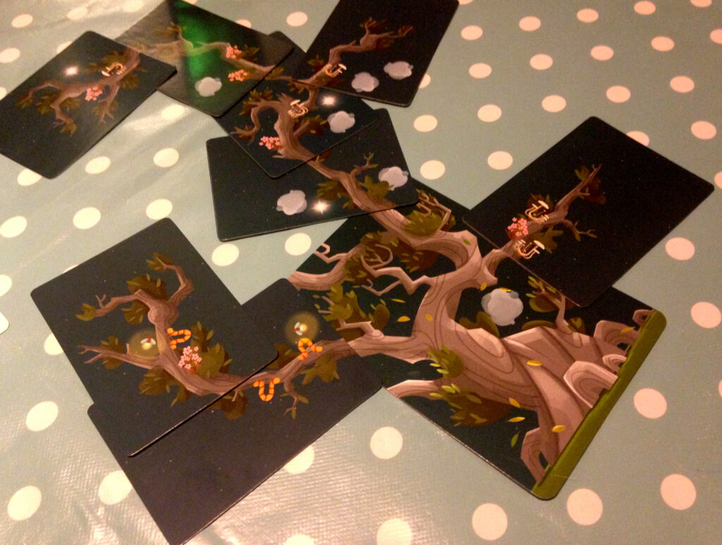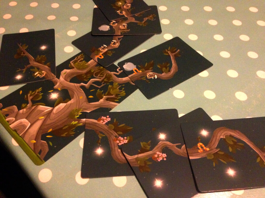 For example; if you add a branch card to your tree that has stars, clouds and flowers on it, you might score five points for flowers, because you have a continuous chain of cards going back to your trunk that all contain flowers – scoring is simply a point for each flower. And maybe you score two points for clouds, because the card you placed immediately before this one also has a cloud – but after that the chain of clouds is broken, so you cannot score any more for clouds. And the star doesn’t have a chain at all, because the card you are ‘growing’ onto doesn’t have a star on it: therefore, no chain = no points for stars.