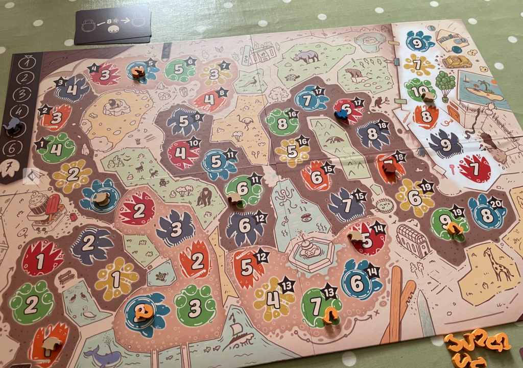 The route out of the zoo – those colours and numbers – is broken into zones. The starting player puts one of their markers somewhere in the first zone, and then it’s the next player’s turn to place a marker: it must be further along the track, but can never jump further than somewhere in the next zone. What you’re doing is two things: using the track to try and signal to the other players what cards you have in your hand, and – needless to say – trying to get as far along it as possible. At some point, someone – maybe everyone – will feel you’ve gone far enough along the track, and it’s time to reveal cards. If together you have enough cards to match or exceed the furthest animal token, then you gain experience points. These can be cashed in to move up through the experience levels, which mean more cards get dealt out, and there are even some shared cards played face-up to the table. More cards means you can move further up the track, and the shared ones are extra helpful because it’s shared knowledge too. However, if you don’t have enough cards, you gain nothing! Move the round marker on and do better!