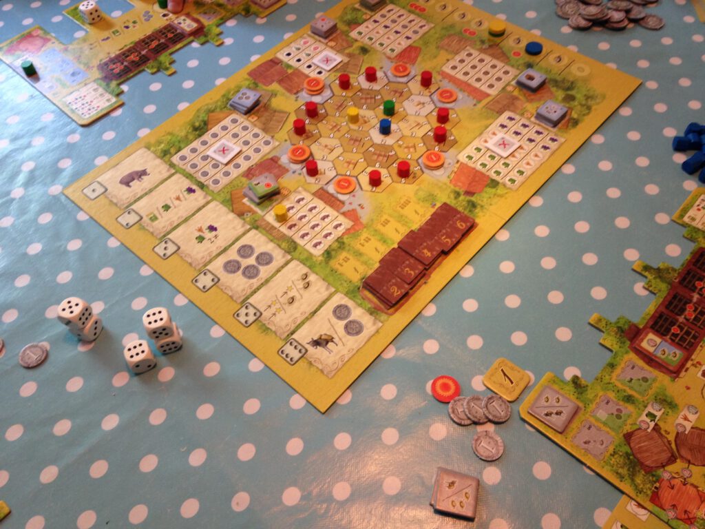 So you’re basically developing and building your farm, and taking what you make to the market, where the more impressive stalls (of a higher numeric value) will bump off any lesser value stores they set up next to. But within these phases is a large degree of flexibility. At any point on your turn you can do a number of things: cash in your trade commodity, pay to upgrade your crops or pigs into food/wine/bacon, flip a roof tile over to cash it in. Overall, a game with many things to juggle and a plethora of options – for the right group, a lovely challenge with lots of replayability.
