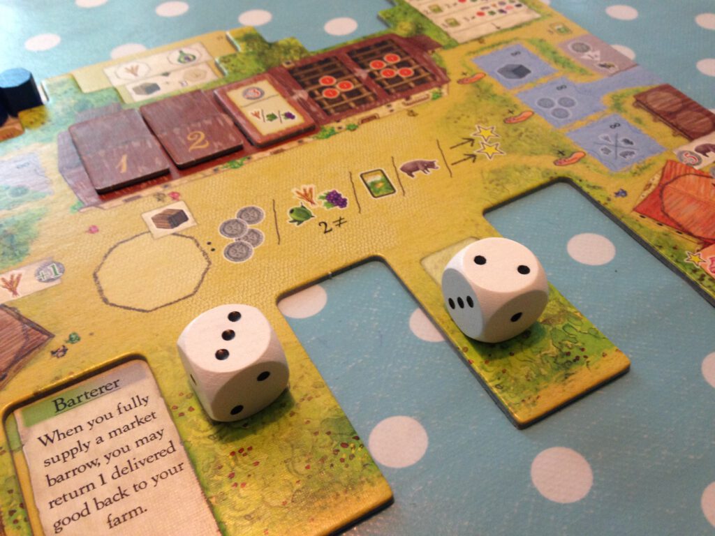 Phase three is deliveries: moving one piece from your farm to somewhere else – either into one of your barrows, or a craft building on the board. It’s usually at this point you fill up a barrow, which means it instantly turns into a market stall on the main board, generating points for you and also a bonus trade commodity – essentially, a valuable joker you can cash in at any time in a number of ways. Every player has one of these at the start of the game. If you deliver everything needed by a craft building, you get a healthy reward for that too; they vary from building to building.