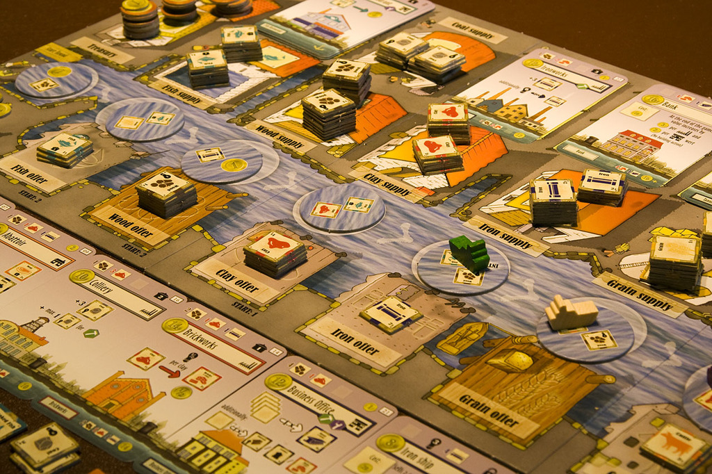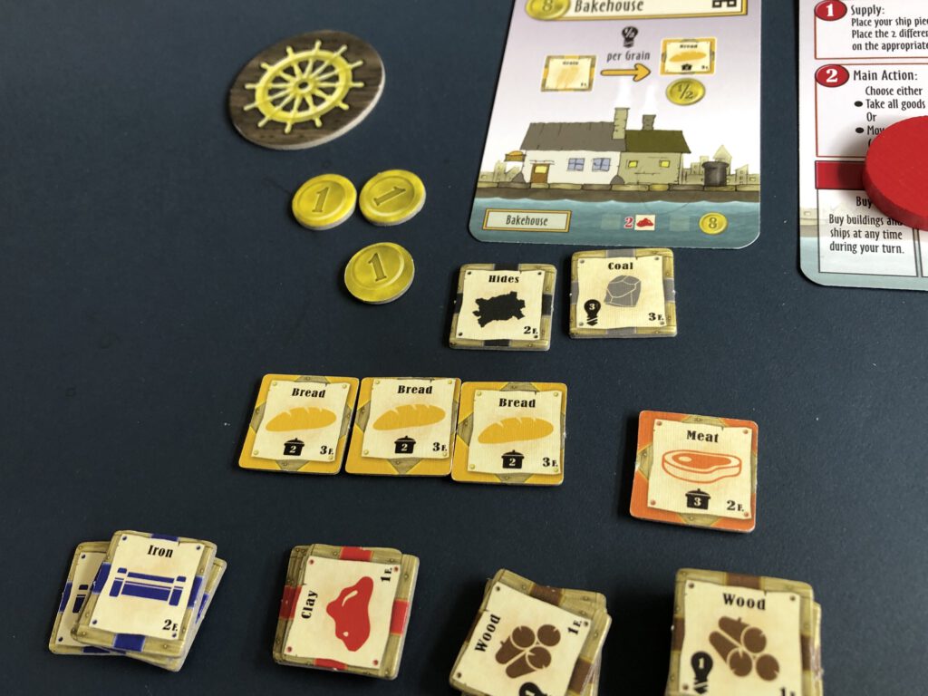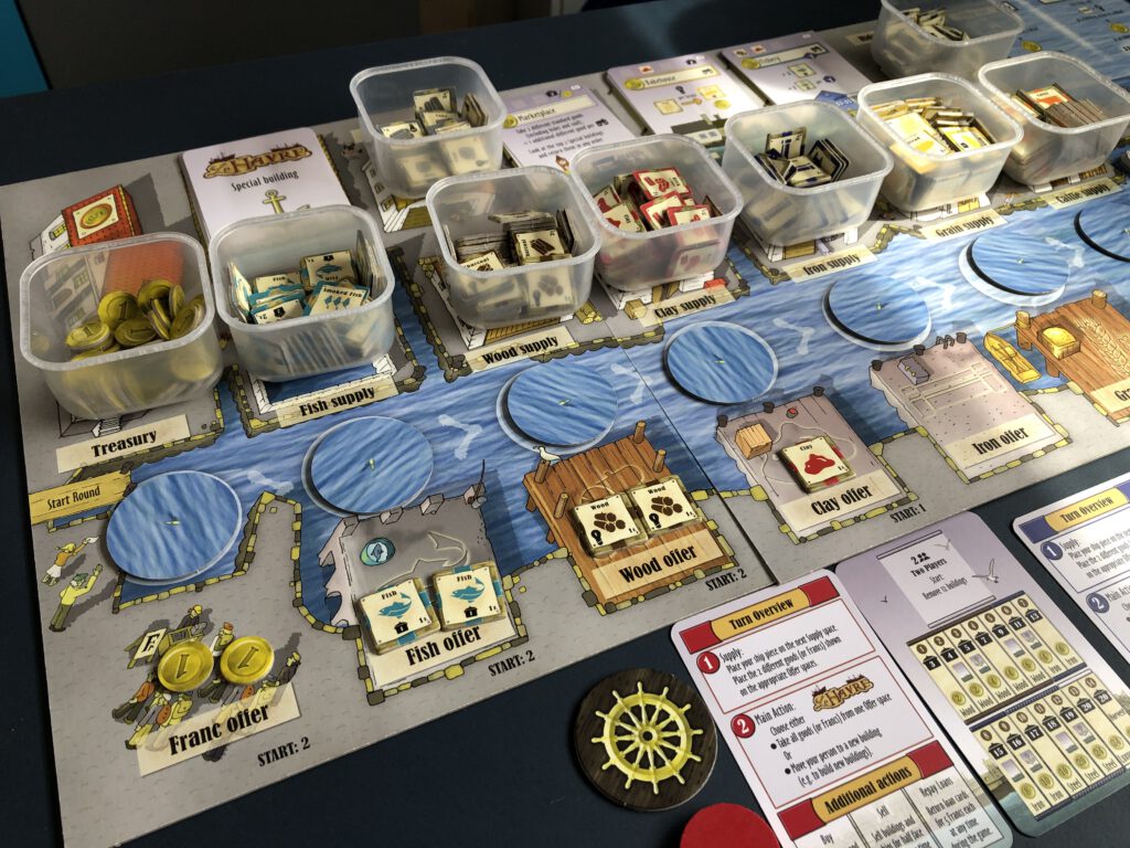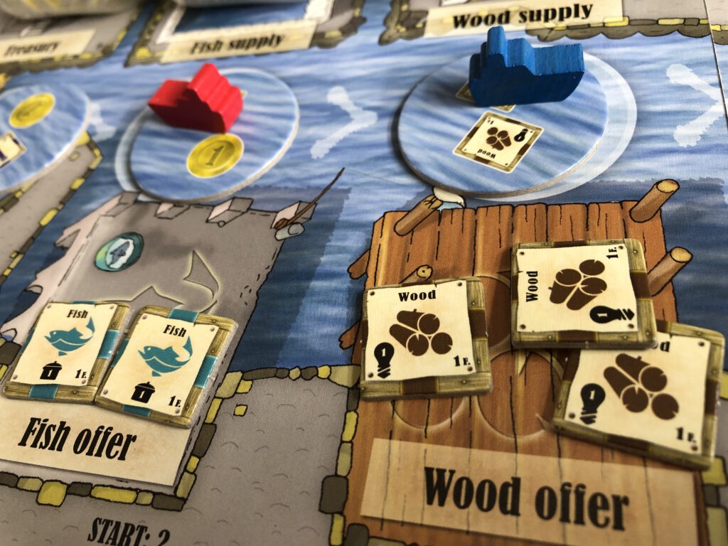 The board is laid out on the table and all the various resource chits placed on it in their denoted spots. A number of building cards – depending on player count – are used in each game; the rulebook clarifies which ones and how they’re set up. Players each have a wooden ship and a disc that’s referred to as a worker. The boats are placed next to the board to the left of the waterway: on your turn, you’ll move your boat to the next available space and do two things: first, the place your boat stops at triggers adding resources to one of the offer spaces on the board – money, fish, clay, wood, iron, grain and cattle all have their own offer space.