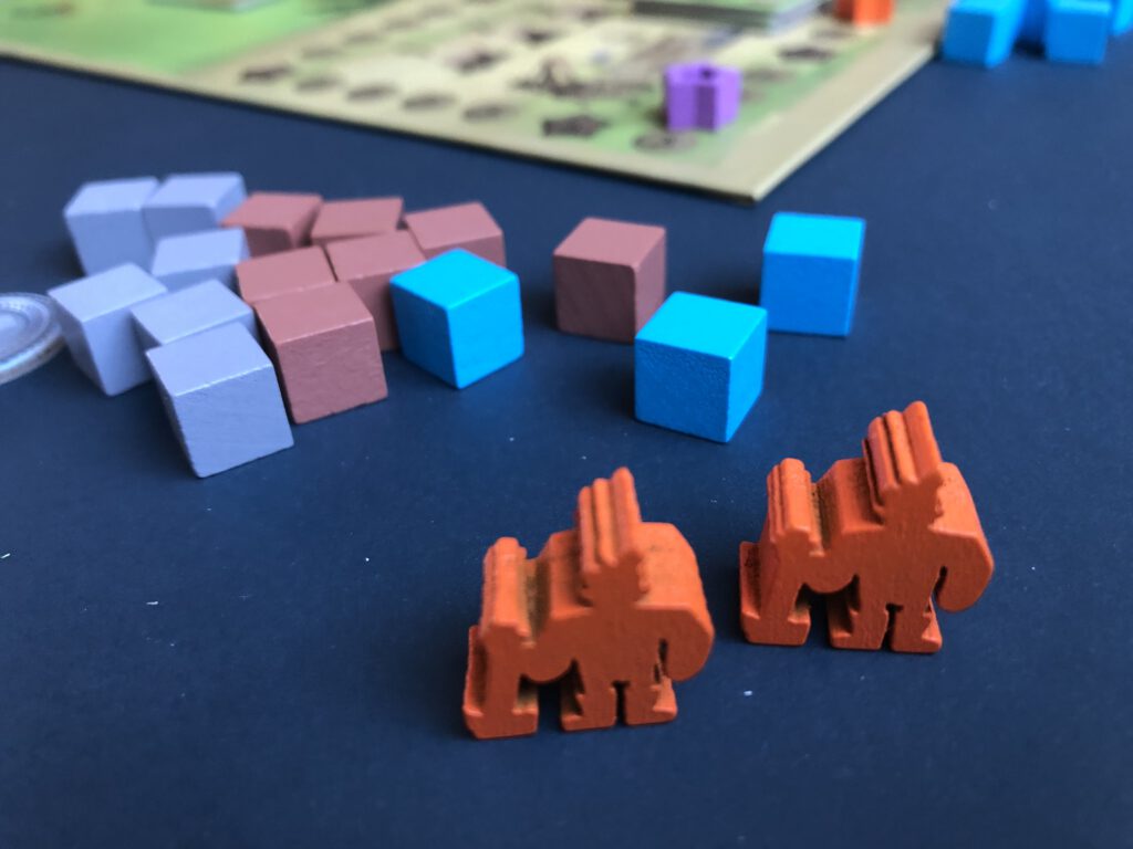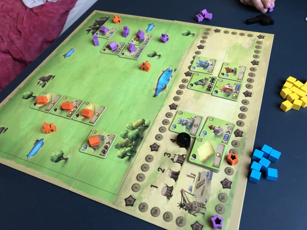The reversible board is placed on the table, and a number of building tiles are placed on the available spaces at the bottom. For your first game, use the buildings with the little Robin on them, and stack the five wheat field tiles (these are considered a ‘building’ as well). Players take a number of wooden buildings and workers in their own colour, three coins, and you’re ready to go.