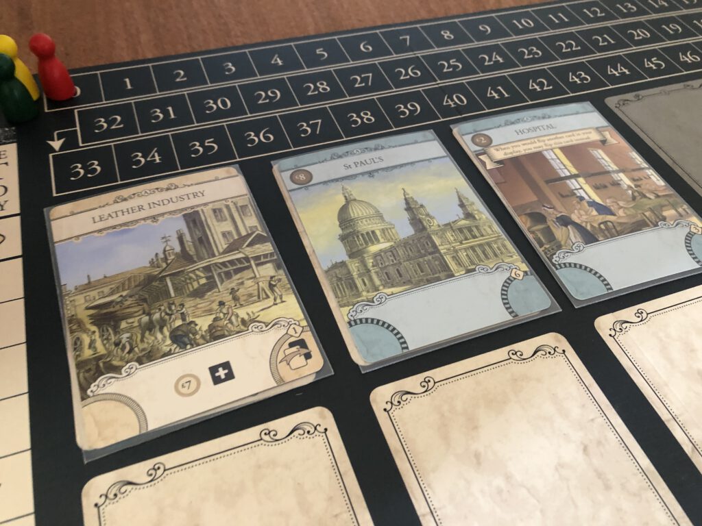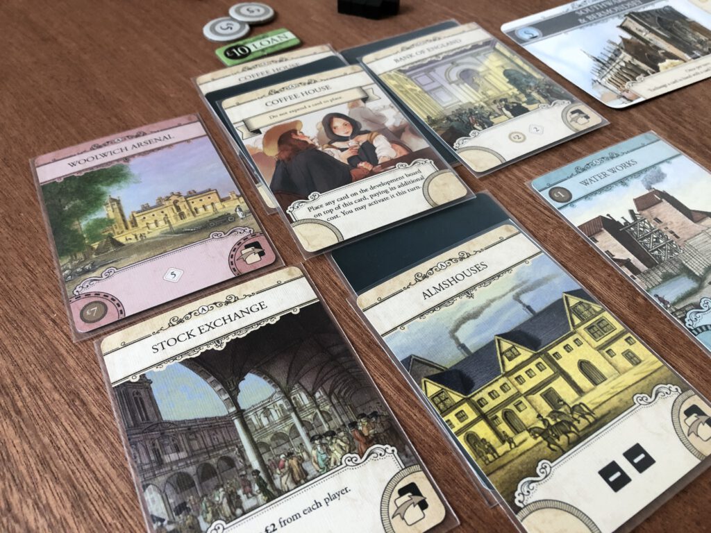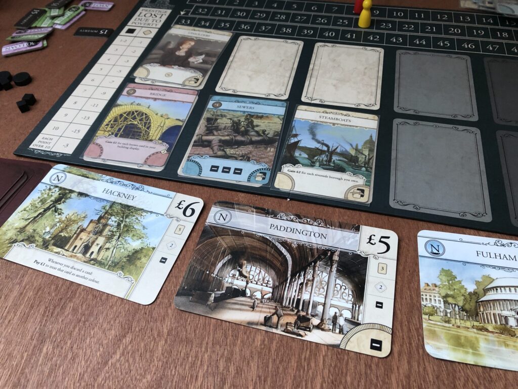 Money is scarce in the game: although many cards give money, many others also demand it in order to be built or run. You can always get money, by taking loans, each worth £1o. But like poverty, they cost you points at game-end. You can pay them back (at a fairly extortionate £15 a pop) but there’s a balance to be struck here: taking no loans at all means playing frugally and can limit your options. Taking too many… well, they’re loans. They’re never cheap!