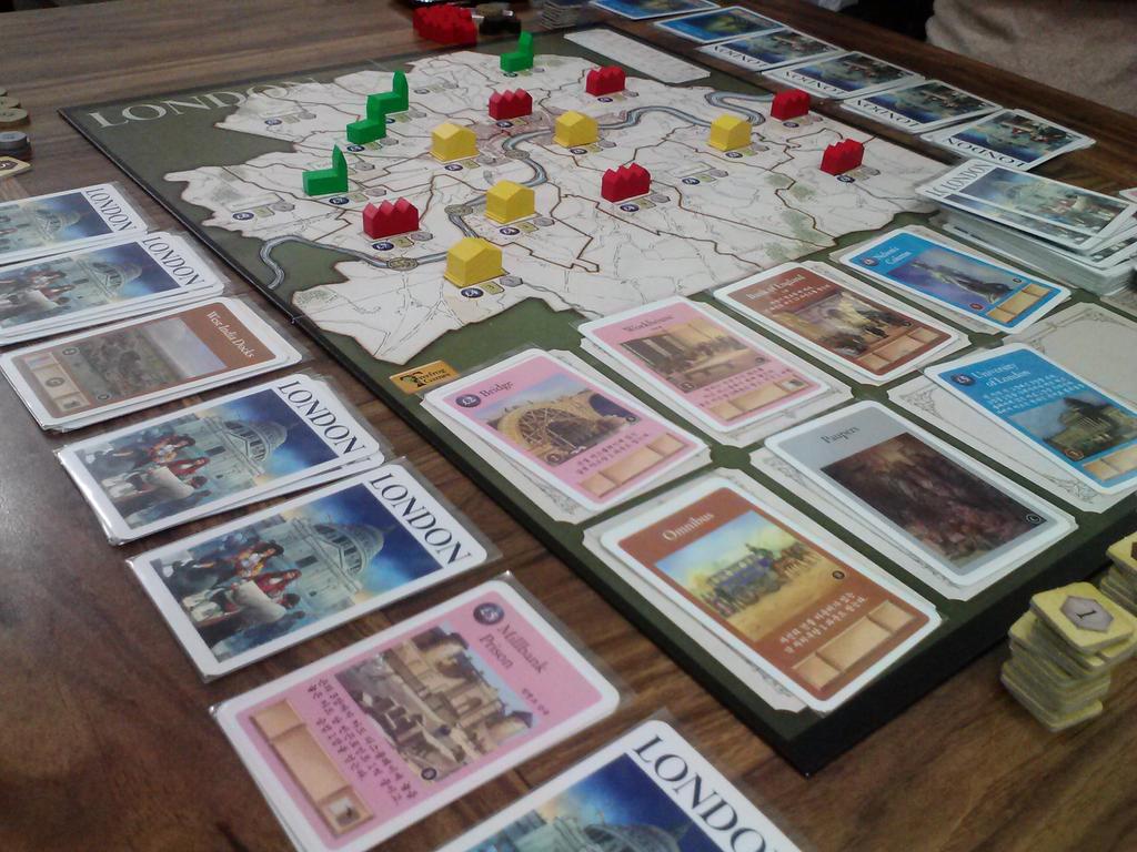 The board shows a map of early London, made up of areas in which the players can establish a presence and, in the latter stages of the game, start building the Underground. Although London comes with a board, it’s essentially a card game. You begin with a hand of cards and on your turn you’ll be adding to your hand from the available selection and choosing which card to play, if any, to your city: a tableau you’re building in front of you on the table.