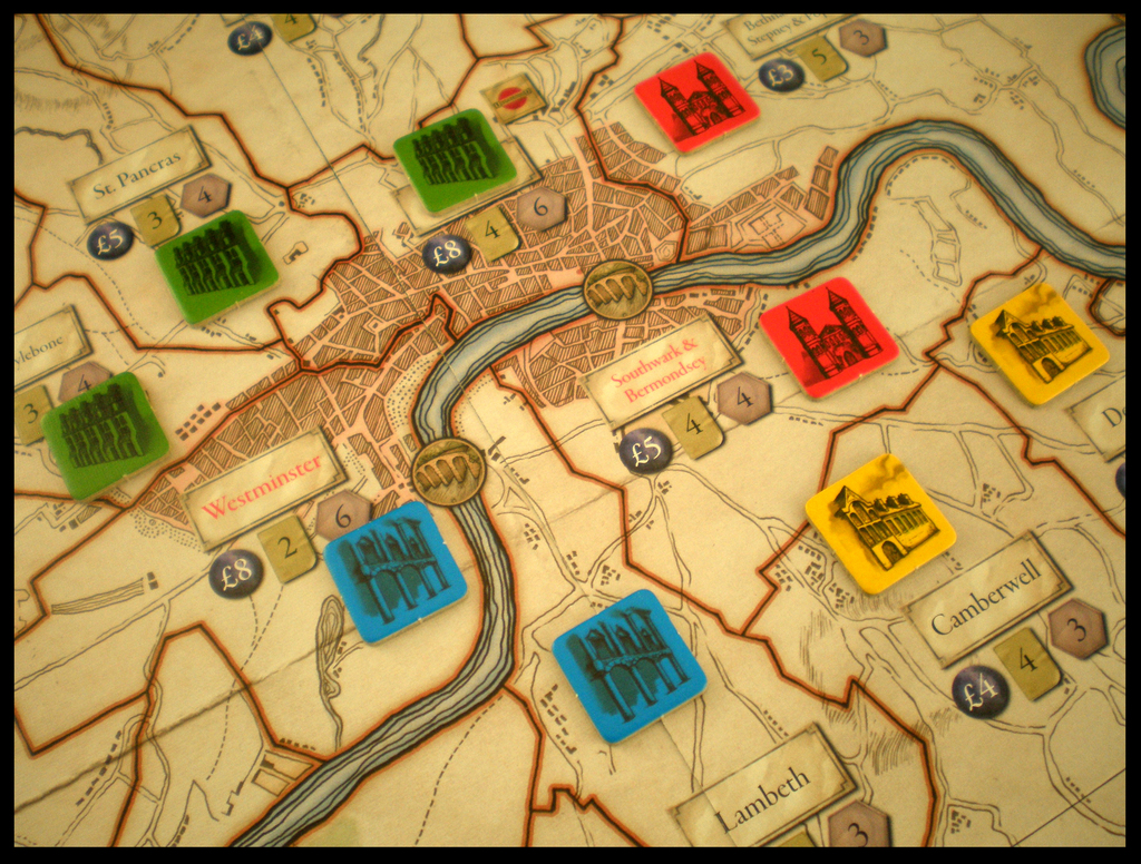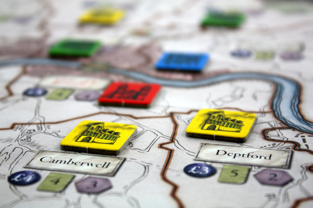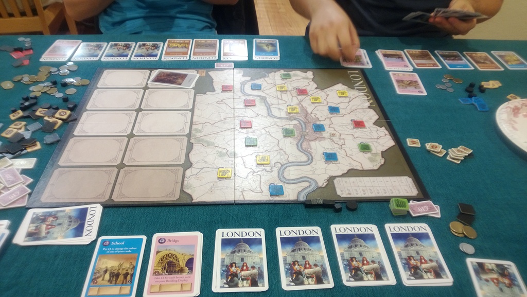 In London players represent overseers of the city’s architecture and culture from the Great Fire until the last century. Players play cards to a tableau in front of them, build buildings, and attempt – hopefully – to eradicate poverty.