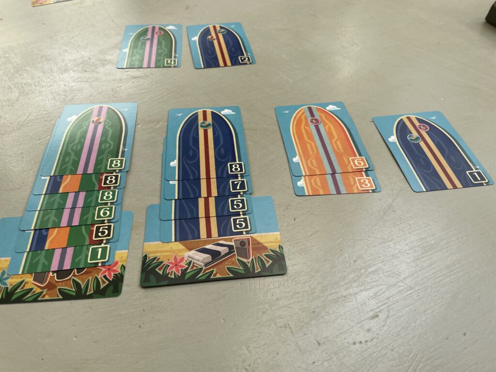 Each card has a number of stickers (0-3) on it that score points when the game ends, but there are other ways to score points too: each game contains a randomized set of objectives: tallest board, two boards of a colour, most boards and so on – that award bonus points. The game can end either when the deck runs out, or optionally when any player who has at least three or four boards (depending on player count) and a board of at least seven cards chooses to end it, and players add up their points and score objectives…. however! any board made up of less than four cards scores minus points.