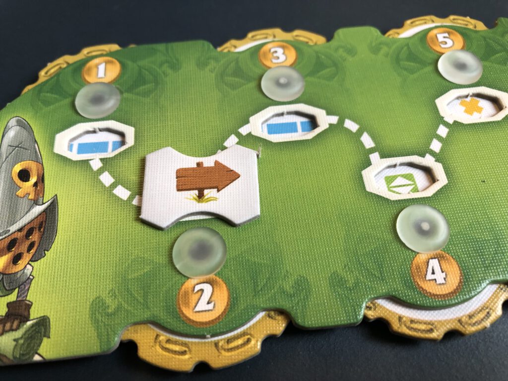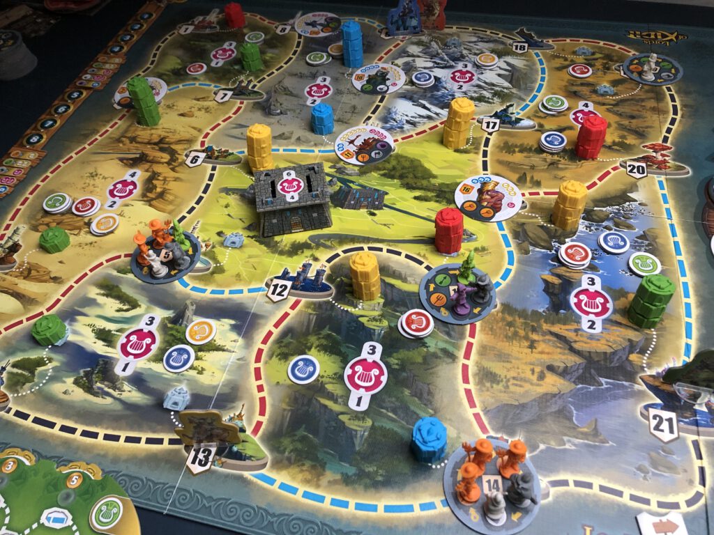 Each player has programming board with which they’ll determine their movements and actions. The board has six ‘slots’ which will be activated, left to right, and what you program into the slots is what you’ll do on the board, as you gallop around on your ‘idrakys’ steed doing derring-dos. The actions are simple: you can move, and the fact each road is one of three distinct colours removes any ambiguity as to where you’re moving to. You can wait – doing nothing momentarily, which can at times be handy – you can take an action at a city.