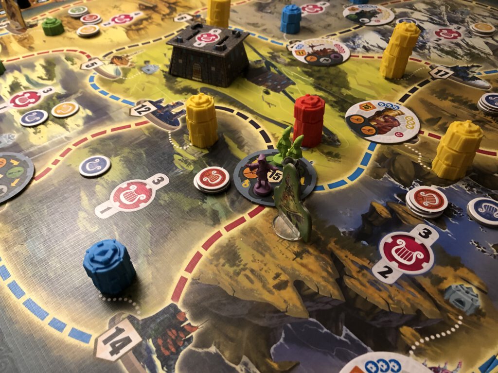 If the city has a threat in it – ie, a monster, presumably roaming the city walls and intercepting Amazon deliveries – you can ‘spend’ your recruits to defeat it (doing so means another monster will pop up elsewhere: there are always five at large). Each monster can only be defeated by a distinct set of recruits, and how hard they are to defeat is also recognised in the rewards we spoke of earlier. The monster tile has three rewards, and you may choose two from the gold (put the gold behind your screen) influence (place your sorcerer’s guild piece/s adjacent to the city) and reputation (place your harp pieces in any adjacent regions). Thematically the sorcerer’s guilds build your influence, and the harps your reputation, as bards sing songs of the great day that you sent two archers and a peasant militia to their deaths – but as far as winning and losing are concerned, it’s just about having more of these things in play than your opponents: when the final year is done, everything is counted for Xidit’s slightly bananas final scoring, which demands its own paragraph.