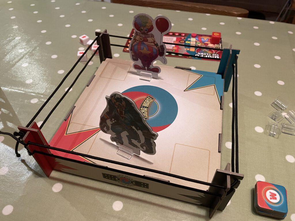 If the rules are a little unclear on edge cases (do all re-rolls happen at the same time?) and the game is a bit woolly in its construction (the wrestling standees are rarely relevant, and the ring needs rebuilding every time you play) there’s enough of a framework to have fun with – a lot of fun, if you like the dice-chucking randomness and feisty spirit of Lucha Wars. Wrestling fans especially may enjoy the chaotic and combative nature of the game, which suggests to me ongoing battles, long-running feuds and championship seasons over a series of plays might add even more to the mix.