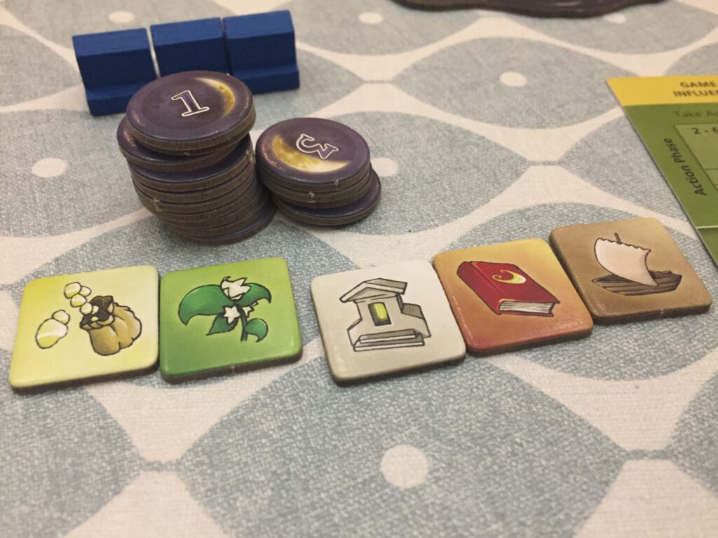 Each player begins the game with five such novices at their disposal – though you can recruit more during play – and they begin the game scattered around the various isles. On your turn you have various actions you can take involving your novices – moving them from island to island, or removing them (in pairs) from an island in order to pick up one of the special action chits. These can then be played: boats can move novices around, herbs help used novices back onto an island, shrines can be built that make your economy cheaper: on an island where you’ve built a shrine, one novice can now to the work of two.